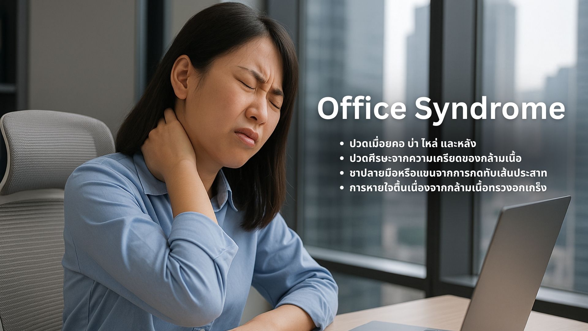 Office Syndrome หรือออฟฟิศซินโดรม คือกลุ่มอาการที่เกิดจากพฤติกรรมซ้ำ ๆ ในชีวิตประจำวัน โดยเฉพาะการนั่งทำงานหน้าคอมพิวเตอร์อย่างต่อเนื่องเป็นเวลานานโดยไม่มีการขยับเปลี่ยนอิริยาบถ ซึ่งสาเหตุหลักมักเกิดจากการนั่งในท่าที่ไม่ถูกต้อง หรือใช้อุปกรณ์สำนักงานที่ไม่รองรับสรีระของผู้ใช้งาน อาการที่พบได้บ่อย ได้แก่