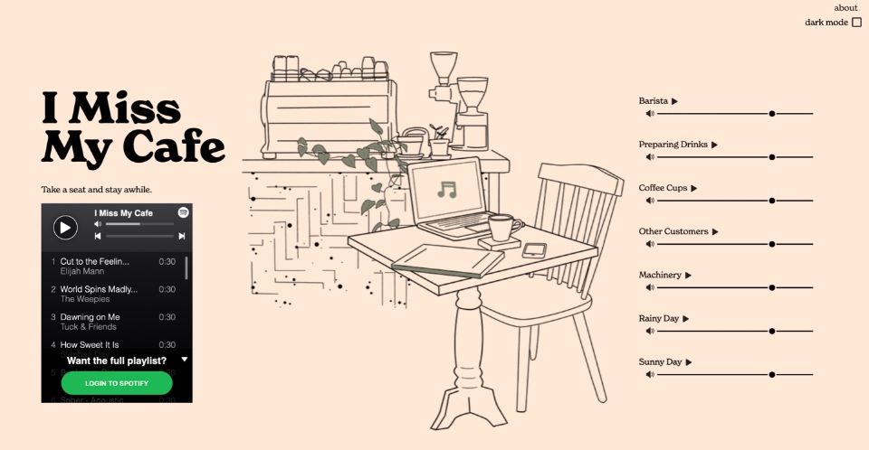 ต่อไปเอาใจสายคาเฟ่เลิฟเวอร์กันหน่อย ใครชอบไปหาคาเฟ่นั่งทำงานก็อาจจะเหงาใจ ไม่มีเสียงเครื่องทำกาเเฟ เสียงช้อนคนกาเเฟ หรือเสียงคนจอเเจให้เเก้เบื่อ เเอดเลยว่าเหมาะกับคนที่อยากสร้างบรรยากาศให้ห้องตัวเองเต็มไปด้วยเสียงของคาเฟ่ทิพย์ บาร์ทิพย์ เเละเเน่นอนว่าช่วงนี้บาร์เทนเดอร์มือใหม่เพียบ เพราะสายคาเฟ่อยู่บ้านนาน ๆ ก็อยากจะลองฝืมือดูบ้าง งั้นก็เปิดเพลย์ลิสต์นี้คลอไปด้วยนะคะ รับรองว่าเพลิน ลิงก์นี้เลยค่ะ https://imissmycafe.com