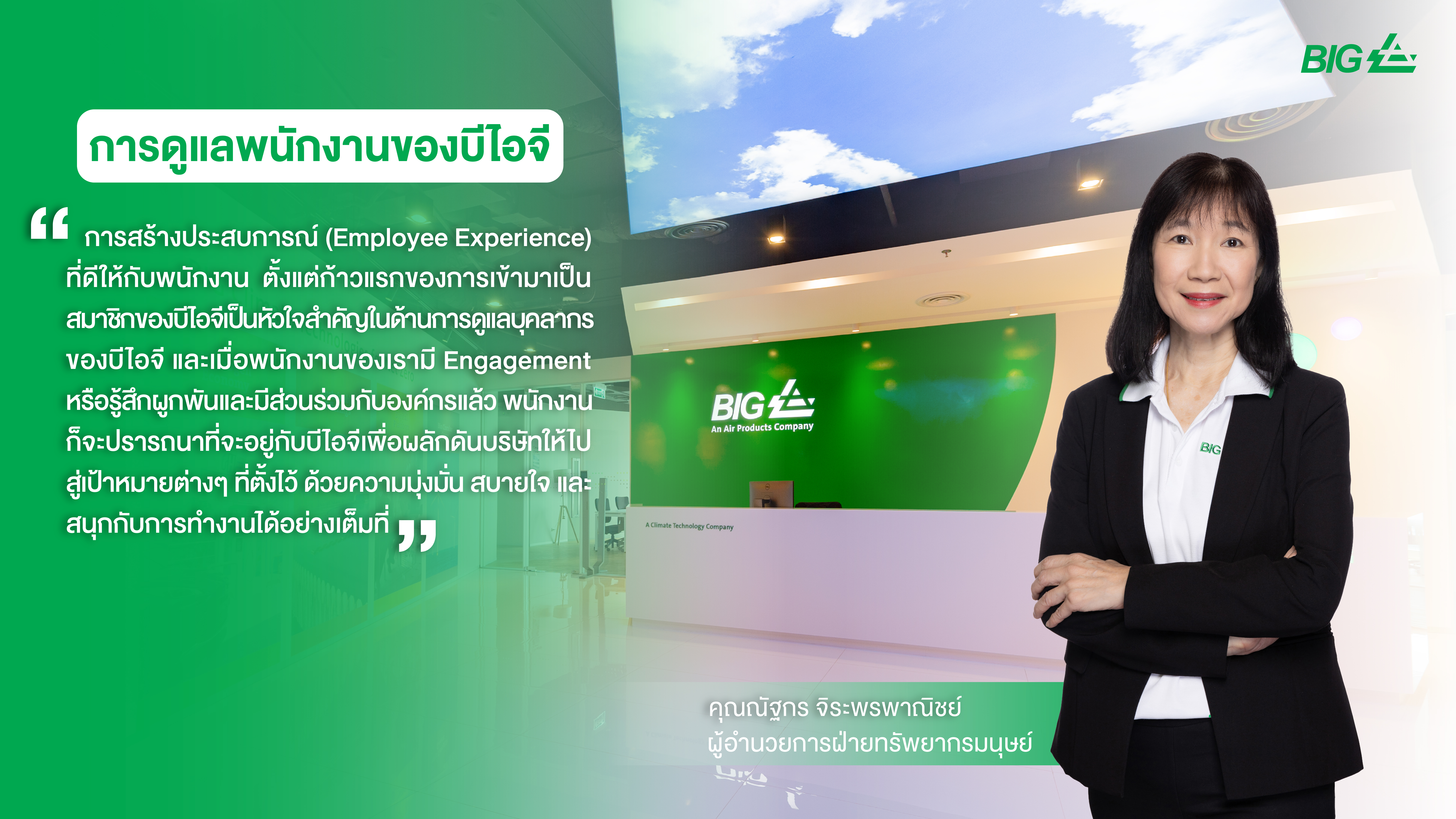 ที่ผ่านมาว่า “การสร้างประสบการณ์ (Employee Experience) ที่ดี ให้กับพนักงานตั้งแต่ก้าวแรกของการเข้ามาเป็นสมาชิกของบีไอจีเป็นหัวใจสำคัญในด้านการดูแลบุคลากรของบีไอจี เมื่อเข้ามาแล้วน้องๆ จะได้รับงานที่สามารถได้เรียนรู้และค้นหาศักยภาพของตนเองไปพร้อมๆ กัน มีพี่เลี้ยง หัวหน้างานและเพื่อนร่วมงานที่เกื้อกูล สนับสนุนการทำงานของเรา ผ่านสังคมการทำงานแบบทีมเวิร์ค เรามีระบบการยกย่องเชิดชู พนักงานที่มีผลงานและช่วยสนับสนุนการทำงานของกันและกัน ผ่านระบบชื่นชม B-Proud โอกาสการเติบโตในการทำงานในเส้นทางความชำนาญการและข้ามสายงาน ฯลฯ ซึ่งสิ่งต่างๆ เหล่านี้ บีไอจีเชื่อว่าเป็นปัจจัยสำคัญที่ทำให้พนักงานมี Employee Engagement กับบริษัท เมื่อพนักงานของเรามี Engagement หรือรู้สึกผูกพันและมีส่วนร่วมกับองค์กรแล้ว พนักงานก็จะปรารถนาที่จะอยู่กับบีไอจี เพื่อผลักดันบริษัทให้ไปสู่เป้าหมายต่างๆ ที่ตั้งไว้ ด้วยความมุ่งมั่น สบายใจ และสนุกกับการทำงานได้อย่างเต็มที่”