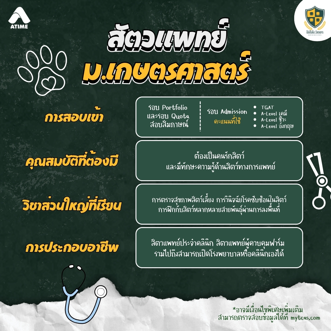 ใครที่รักสัตว์เป็นชีวิตจิตใจ และมีความฝันที่อยากช่วยเหลือสัตว์ทุกชนิดให้มีสุขภาพดี ก็ต้องพาตัวเองมาที่ “คณะสัตวแพทยศาสตร์ มหาวิทยาลัยเกษตรศาสตร์” ได้เลย ที่นี่จะให้น้อง ๆ ได้เปลี่ยนความรักเป็นความรู้แบบมืออาชีพ หลักสูตรที่นี่เน้นทั้งภาคทฤษฎีและการฝึกปฏิบัติจริง ตั้งแต่การตรวจสุขภาพสัตว์เลี้ยง การวินิจฉัยโรคซับซ้อนในสัตว์ ไปจนถึงการผ่าตัดสุดท้าทาย ที่สำคัญน้อง ๆ จะได้ฝึกกับสัตว์หลากหลายสายพันธุ์ผ่านการลงพื้นที่อีกด้วย จบจากที่นี่สามารถทำงานได้หลากหลาย ไม่ว่าจะเป็นสัตวแพทย์ประจำในคลินิกเอกชนหรือหน่วยงานราชการ สัตวแพทย์ผู้ควบคุมฟาร์ม , ผู้แทนขายผลิตภัณฑ์ เช่น ยา อาหารสัตว์ ผลิตภัณฑ์เวชภัณฑ์ ครุภัณฑ์ต่าง ๆ รวมไปถึงสามารถเปิดโรงพยาบาลหรือคลินิกเองได้