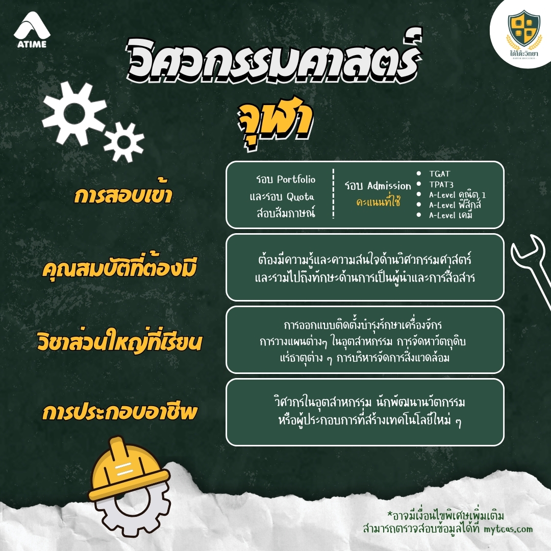 วิศวะ จุฬา นับเป็นอีกหนึ่งในคณะยอดนิยมสำหรับน้อง ๆ ที่มีความฝันอยากจะเป็นนักวิศวกร หลักสูตรที่นี่ครอบคลุมทุกสาขาวิชาวิศวกรรม และมีถึง 20 สาขาอีกด้วยรวมทั้งภาคปกติและภาคอินเตอร์ โดยมีตั้งแต่วิศวกรรมเครื่องกล วิศวกรรมยานยนต์ วิศวกรรมโยธา วิศวกรรมไฟฟ้า ไปจนถึงวิศวกรรมเหมืองแร่และปิโตรเลียม พร้อมด้วยอุปกรณ์การเรียนและห้องปฏิบัติการที่ทันสมัย อย่างห้องแล็บ MI the Making of Innovatist center น้อง ๆ จะได้ทั้งความรู้และประสบการณ์จากการทำโปรเจกต์จริง เมื่อจบไป เส้นทางอาชีพก็หลากหลาย ไม่ว่าจะเป็นวิศวกรในอุตสาหกรรมต่าง ๆ นักพัฒนานวัตกรรม หรือผู้ประกอบการที่สร้างเทคโนโลยีใหม่ ๆ ใครอยากเป็นผู้นำด้านเทคโนโลยีและการออกแบบโลกอนาคต วิศวกรรมศาสตร์ จุฬาฯ คือจุดเริ่มต้นที่ไม่ควรพลาดจริง ๆ