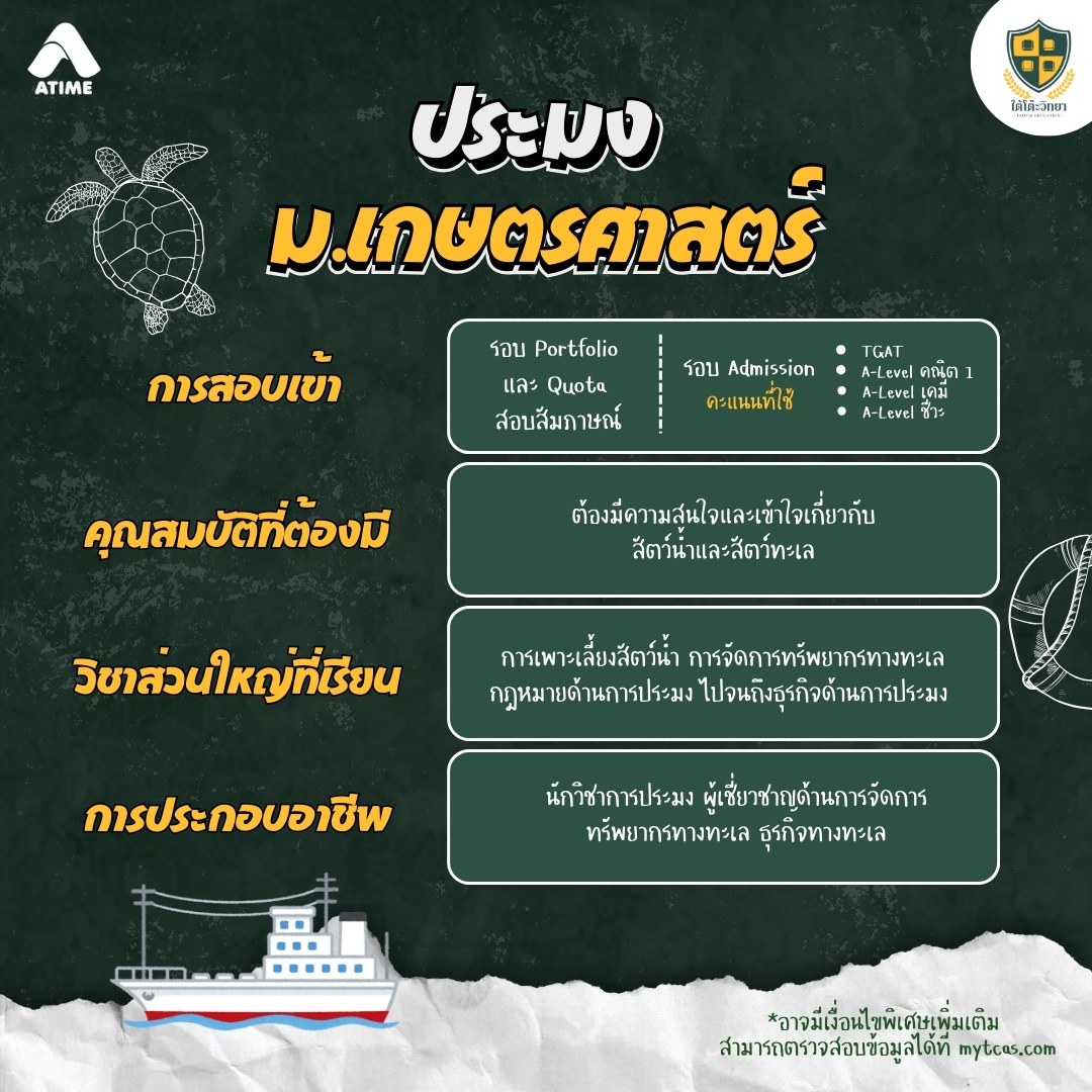 มาเริ่มต้นกันที่ คณะประมง ม.เกษตรศาสตร์ ถ้าพูดถึงคณะ และมหาวิทยาลัยที่ขึ้นชื่อเรื่องวิทยาศาสตร์ทางทะเล ก็คงหนีไม่พ้นที่นี่ คณะนี้ไม่ใช่เรียนแค่เรื่องสัตว์ทะเลอย่างที่หลายคนคิด แต่น้อง ๆ จะได้เรียนรู้ทั้งระบบนิเวศทางน้ำ การเพาะเลี้ยงสัตว์น้ำ การจัดการทรัพยากรทางทะเล กฎหมายด้านการประมง ไปจนถึงธุรกิจด้านการประมง คณะเหมาะสำหรับคนที่หลงใหลในโลกใต้น้ำและอยากมีส่วนร่วมในการอนุรักษ์ธรรมชาติ จบไปสามารถทำงานได้หลากหลาย ทั้งนักวิชาการประมง ผู้เชี่ยวชาญด้านการจัดการทรัพยากรทางทะเล หรือแม้กระทั่งธุรกิจทางทะเล ใครที่อยากผจญภัยในเส้นทางสายประมง บอกเลยว่าคณะนี้ตอบโจทย์สุด ๆ