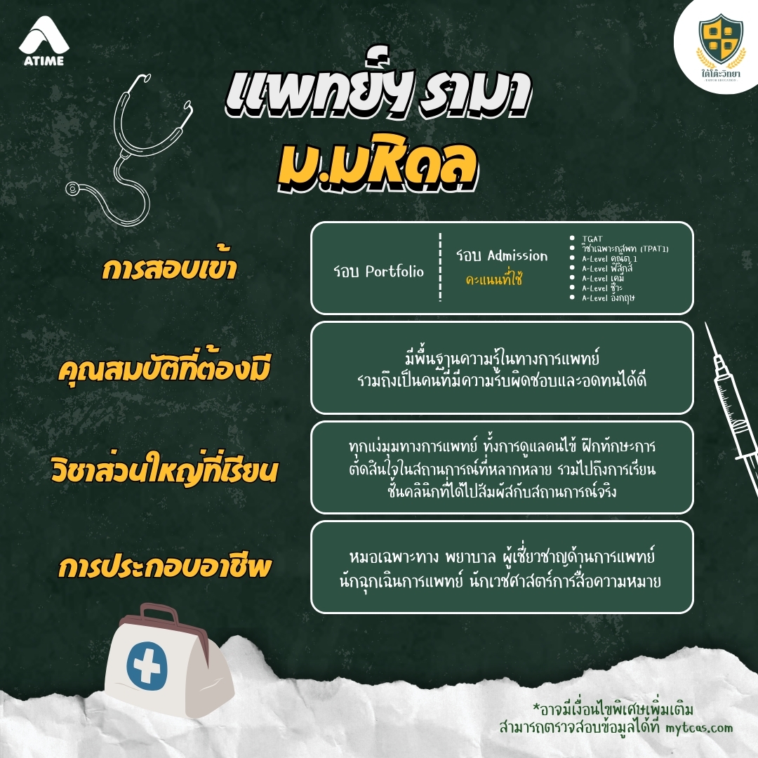 มาต่อกันที่คณะในฝันของใครหลาย ๆ คนที่อยากจะเป็นหมอ และพร้อมที่จะลุยไปกับการเรียนสุดเข้มข้น “คณะแพทยศาสตร์โรงพยาบาลรามาธิบดี ม.มหิดล” คือที่ที่ทุกคนจะได้สัมผัสทั้งทฤษฎี และการปฏิบัติแบบเต็มรูปแบบ ตั้งแต่ห้องเรียนสู่ห้องผ่าตัดจริง น้อง ๆ จะได้เรียนรู้การดูแลคนไข้ ฝึกทักษะการตัดสินใจในสถานการณ์ที่หลากหลาย รวมไปถึงการเรียนชั้นคลินิกที่ได้ไปสัมผัสกับสถานการณ์จริง และร่วมทีมกับบุคลากรทางการแพทย์ที่เก่งที่สุด จบไปมีอนาคตที่มั่นคงและหลากหลาย ไม่ว่าจะเป็นหมอเฉพาะทาง พยาบาล ผู้เชี่ยวชาญด้านการแพทย์ นักฉุกเฉินการแพทย์ หรือแม้กระทั่งนักเวชศาสตร์การสื่อความหมาย