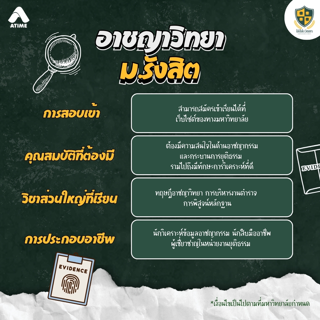 เรื่องราวการสืบสวนสอบสวนมาถึงแล้ว หากน้อง ๆ คนไหนที่สนใจในเรื่องปริศนาอาชญากรรม และอยากเข้าใจเบื้องหลังพฤติกรรมของผู้กระทำความผิด “คณะอาชญาวิทยา มหาวิทยาลัยรังสิต” คือที่ที่จะพาน้อง ๆ ไปสู่โลกแห่งการศึกษาและแก้ไขปัญหาอาชญากรรมอย่างรอบด้าน ที่นี่ครอบคลุมเนื้อหาการเรียนตั้งแต่ทฤษฎีอาชญาวิทยา การบริหารงานตำรวจ การพิสูจน์หลักฐาน หลักการทางนิติวิทยาศาสตร์และกฎหมาย เป็นต้น น้อง ๆ จะได้ฝึกวิเคราะห์คดี เรียนรู้การเก็บหลักฐานในที่เกิดเหตุ และเข้าใจระบบกระบวนการยุติธรรม จบไปสามารถทำงานได้หลากหลาย ไม่ว่าจะเป็นนักวิเคราะห์ข้อมูลอาชญากรรม นักสืบมืออาชีพ ผู้เชี่ยวชาญในหน่วยงานยุติธรรม หรือแม้กระทั่งทำงานในองค์กรป้องกันอาชญากรรม ผู้เชี่ยวชาญในหน่วยงานยุติธรรม