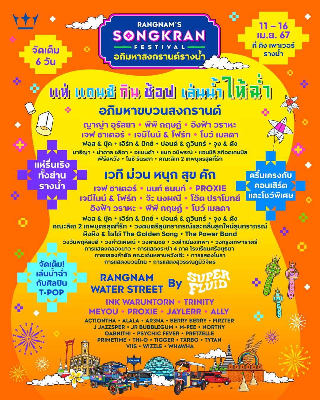 จัดเต็มอภิมหาขบวนสงกรานต์ คณะคอนเสิร์ต และโชว์สนุก ๆ ตลอด 6 วัน ตั้งแต่วันที่ 11-16 เมษายน 2567 ที่ คิง เพาเวอร์ รางน้ำ