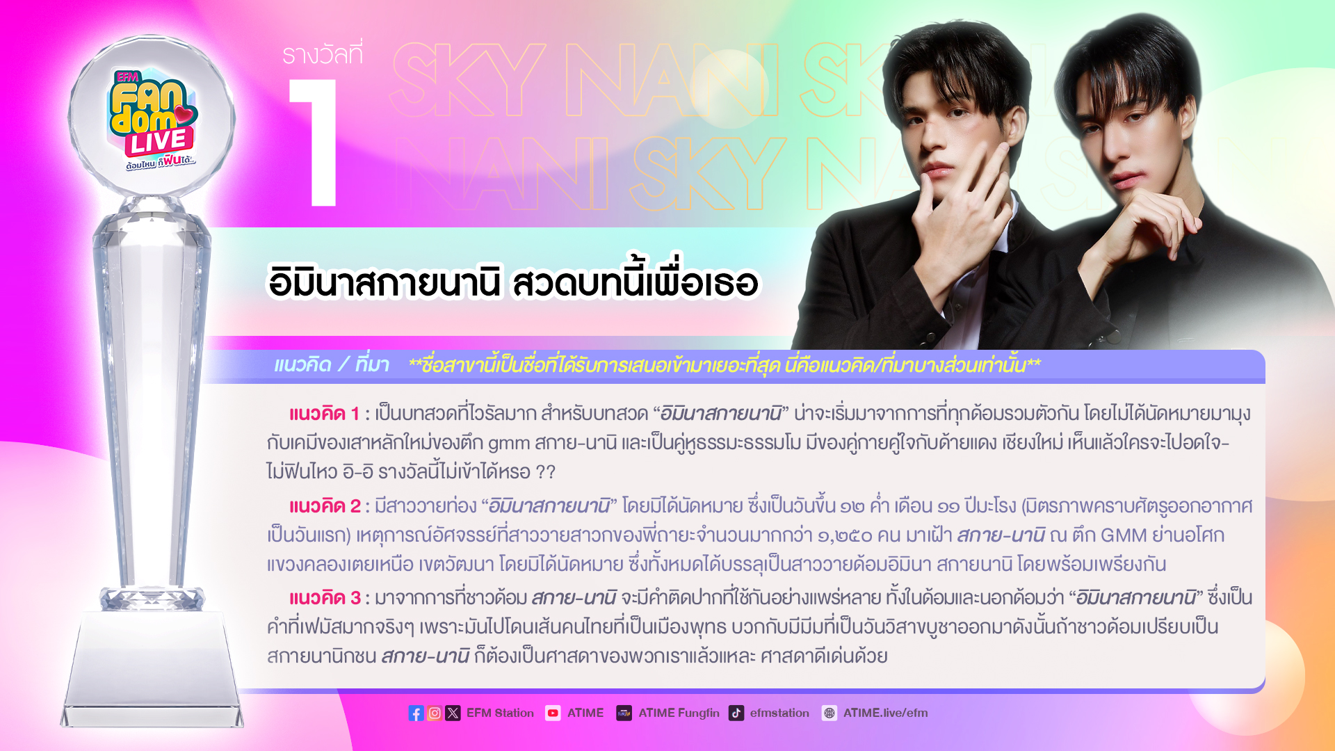 แนวคิด 1 : เป็นบทสวดที่ไวรัลมาก สำหรับบทสวด “อิมินาสกายนานิ” น่าจะเริ่มมาจากการที่ทุกด้อมรวมตัวกันโดยไม่ได้นัดหมาย มามุงกับเคมีของเสาหลักใหม่ของตึก gmm สกาย-นานิ และเป็นคู่หูธรรมะธรรมโม มีของคู่กายคู่ใจกับด้ายแดง เชียงใหม่ เห็นแล้วใครจะไปอดใจไม่ฟินไหว อิ-อิ รางวัลนี้ไม่เข้าได้หรอ??