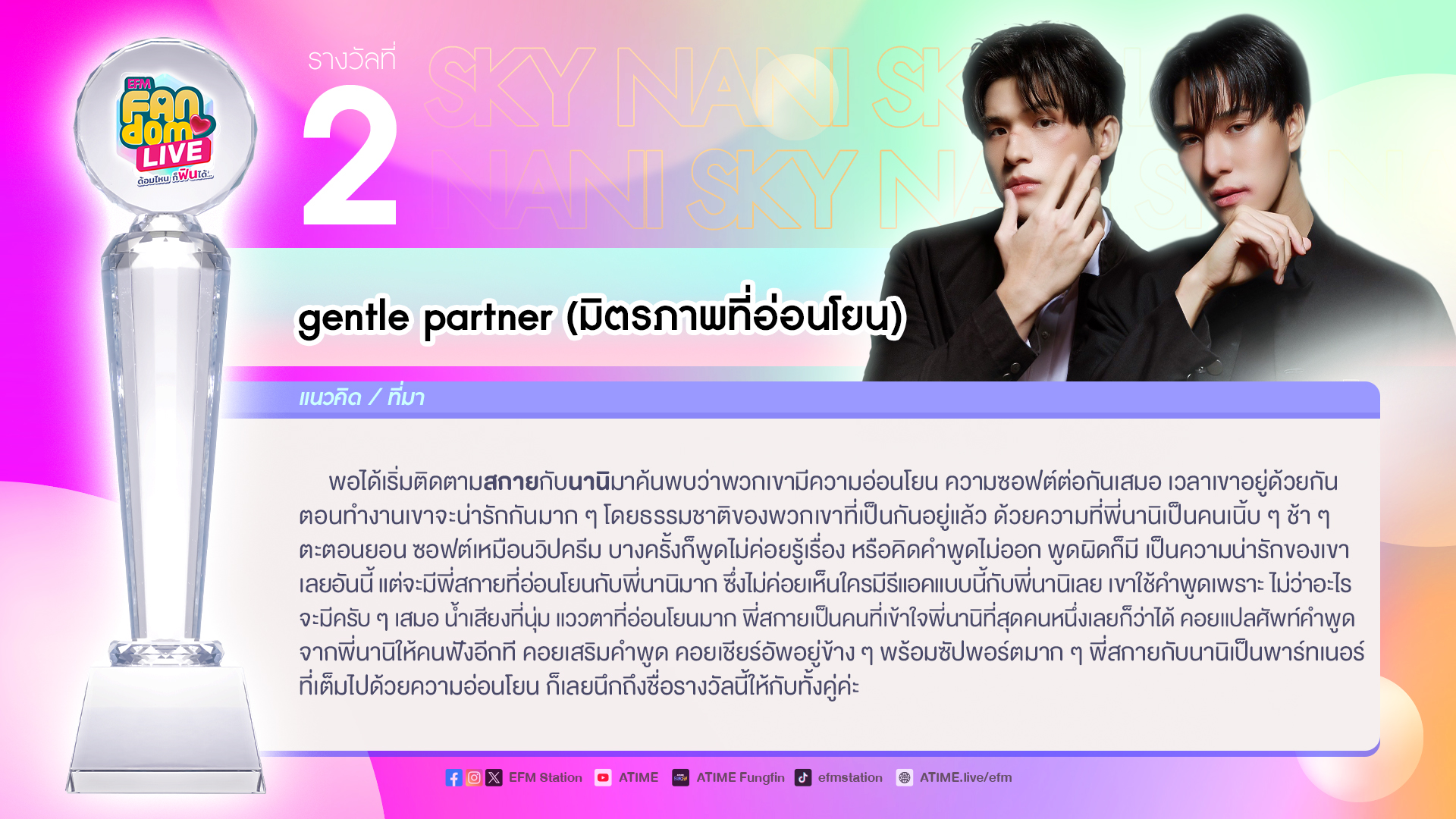 พอได้เริ่มติดตามสกายกับนานิมาค้นพบว่าพวกเขามีความอ่อนโยน ความซอฟต์ต่อกันเสมอ เวลาเขาอยู่ด้วยกันตอนทำงานเขาจะน่ารักกันมากๆ โดยธรรมชาติของพวกเขาที่เป็นกันอยู่แล้ว ด้วยความที่พี่นานิเป็นคนเนิ้บๆ ช้าๆ ตะตอนยอน ซอฟต์เหมือนวิปครีม บางครั้งก็พูดไม่ค่อยรู้เรื่อง หรือคิดคำพูดไม่ออก พูดผิดก็มี เป็นความน่ารักของเขาเลยอันนี้ แต่จะมีพี่สกายที่อ่อนโยนกับพี่นานิมาก ซึ่งไม่ค่อยเห็นใครมีรีแอคแบบนี้กับพี่นานิเลย เขาใช้คำพูดเพราะ ไม่ว่าอะไรจะมีครับๆเสมอ น้ำเสียงที่นุ่ม แววตาที่อ่อนโยนมาก พี่สกายเป็นคนที่เข้าใจพี่นานิที่สุดคนหนึ่งเลยก็ว่าได้ คอยแปลศัพท์คำพูดจากพี่นานิให้คนฟังอีกที คอยเสริมคำพูด คอยเชียร์อัพอยู่ข้างๆ พร้อมซัปพอร์ตมากๆ พี่สกายกับนานิเป็นพาร์ทเนอร์ที่เต็มไปด้วยความอ่อนโยน ก็เลยนึกถึงชื่อรางวัลนี้ให้กับทั้งคู่ค่ะ