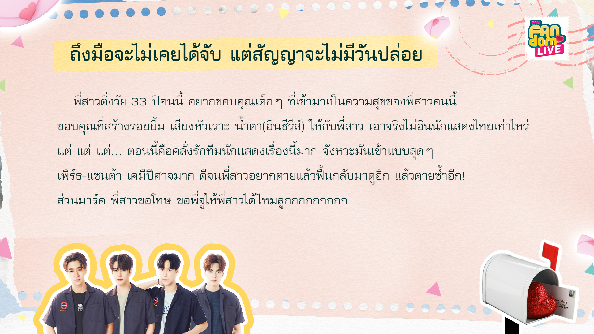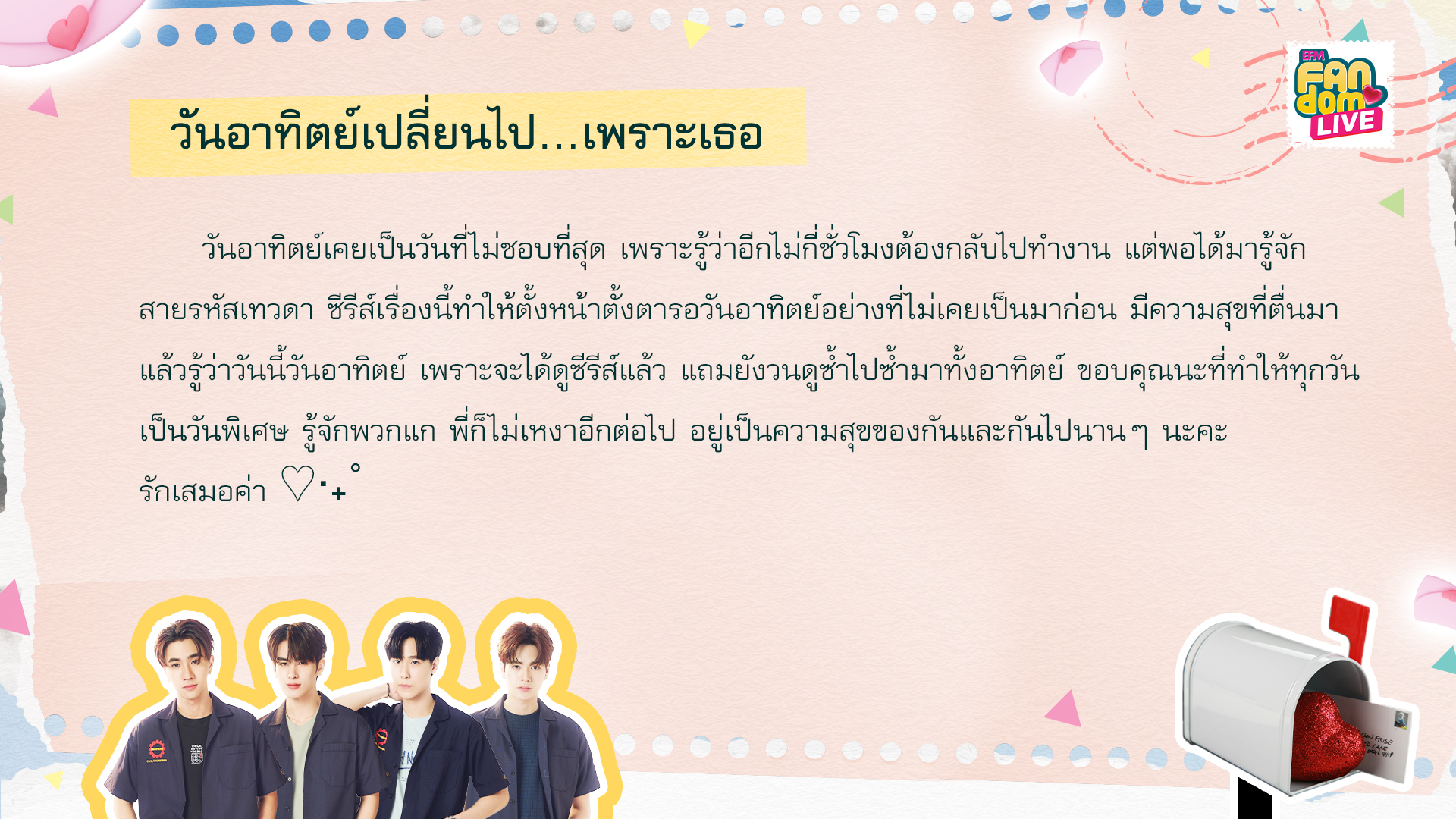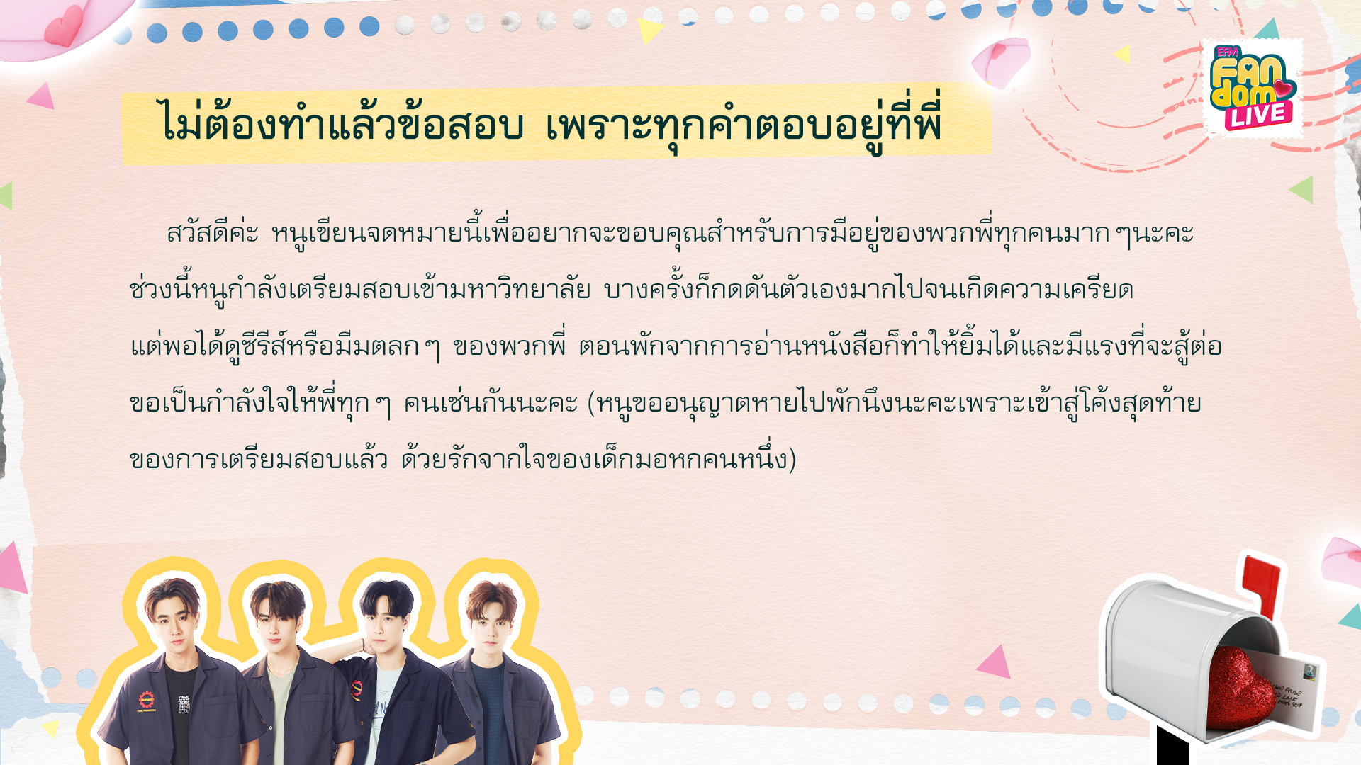 สวัสดีค่ะ หนูเขียนจดหมายนี้เพื่ออยากจะขอบคุณสำหรับการมีอยู่ของพวกพี่ทุกคนมากๆนะคะ ช่วงนี้หนูกำลังเตรียมสอบเข้ามหาวิทยาลัย บางครั้งก็กดดันตัวเองมากไปจนเกิดความเครียด แต่พอได้ดูซีรีส์หรือมีมตลกๆของพวกพี่ ตอนพักจากการอ่านหนังสือก็ทำให้ยิ้มได้และมีแรงที่จะสู้ต่อ ขอเป็นกำลังใจให้พี่ทุกๆคนเช่นกันนะคะ (หนูขออนุญาตหายไปพักนึงนะคะเพราะเข้าสู่โค้งสุดท้ายของการเตรียมสอบแล้ว ด้วยรักจากใจของเด็กมอหกคนหนึ่ง)