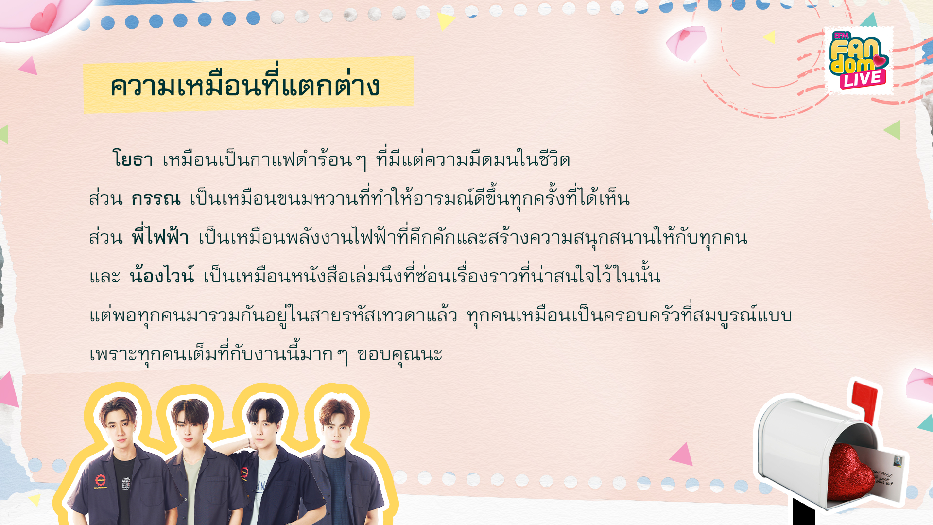 สุดท้ายนี้... รายการ EFM FANDOM LIVE ขอขอบคุณ “บุ๊ค – แซนต้า – จูเนียร์ – มาร์ค” มากๆเลยน้าที่มาร่วมพูดคุย สร้างสีสัน ความน่ารัก สร้างความสนุก ความสุขให้กับแฟนๆ และฝากซีรีส์ "สายรหัสเทวดา Perfect 10 Liners" ทุกวันอาทิตย์ เวลา 20:30 น. ทางช่อง GMM25 และ WeTV เท่านั้นน้าา