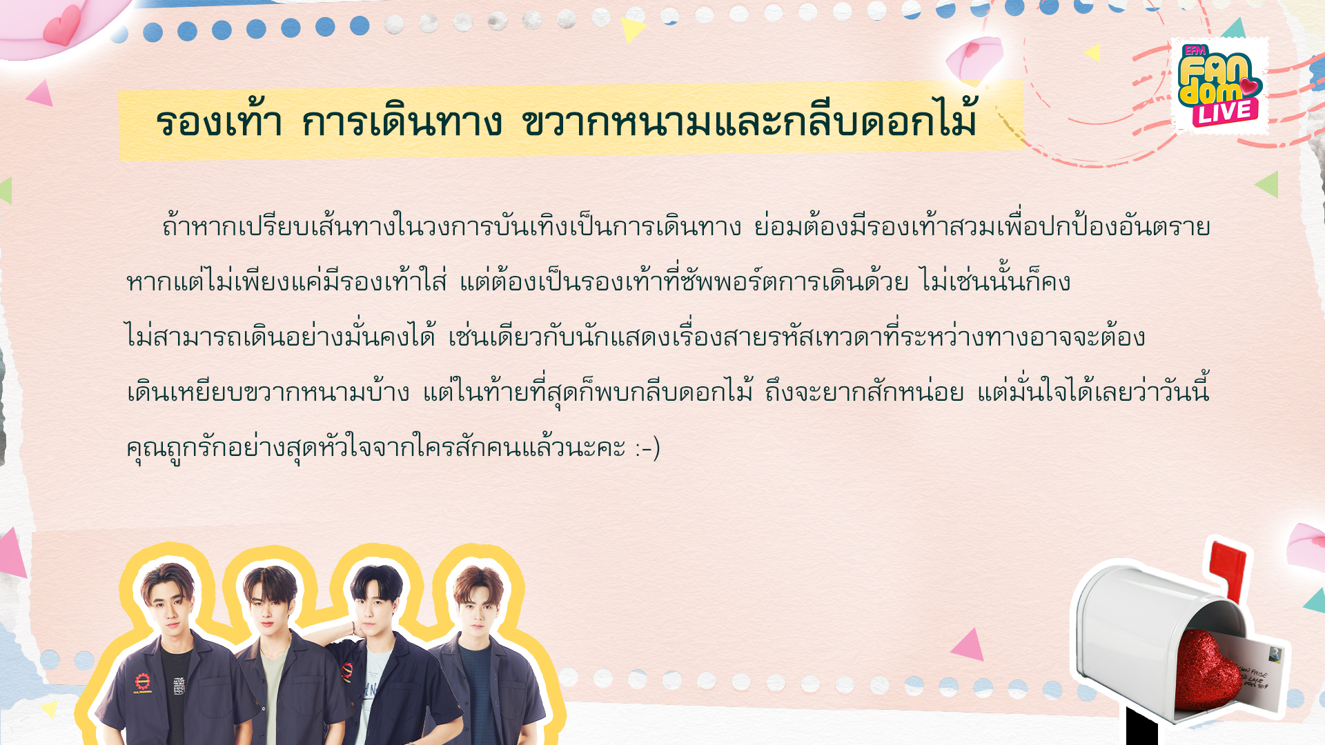 ถ้าหากเปรียบเส้นทางในวงการบันเทิงเป็นการเดินทาง ย่อมต้องมีรองเท้าสวมเพื่อปกป้องอันตราย หากแต่ไม่เพียงแค่มีรองเท้าใส่ แต่ต้องเป็นรองเท้าที่ซัพพอร์ตการเดินด้วย ไม่เช่นนั้นก็คงไม่สามารถเดินอย่างมั่นคงได้ เช่นเดียวกับนักแสดงเรื่องสายรหัสเทวดาที่ระหว่างทางอาจจะต้องเดินเหยียบขวากหนามบ้าง แต่ในท้ายที่สุดก็พบกลีบดอกไม้ ถึงจะยากสักหน่อย แต่มั่นใจได้เลยว่าวันนี้คุณถูกรักอย่างสุดหัวใจจากใครสักคนแล้วนะคะ :-)