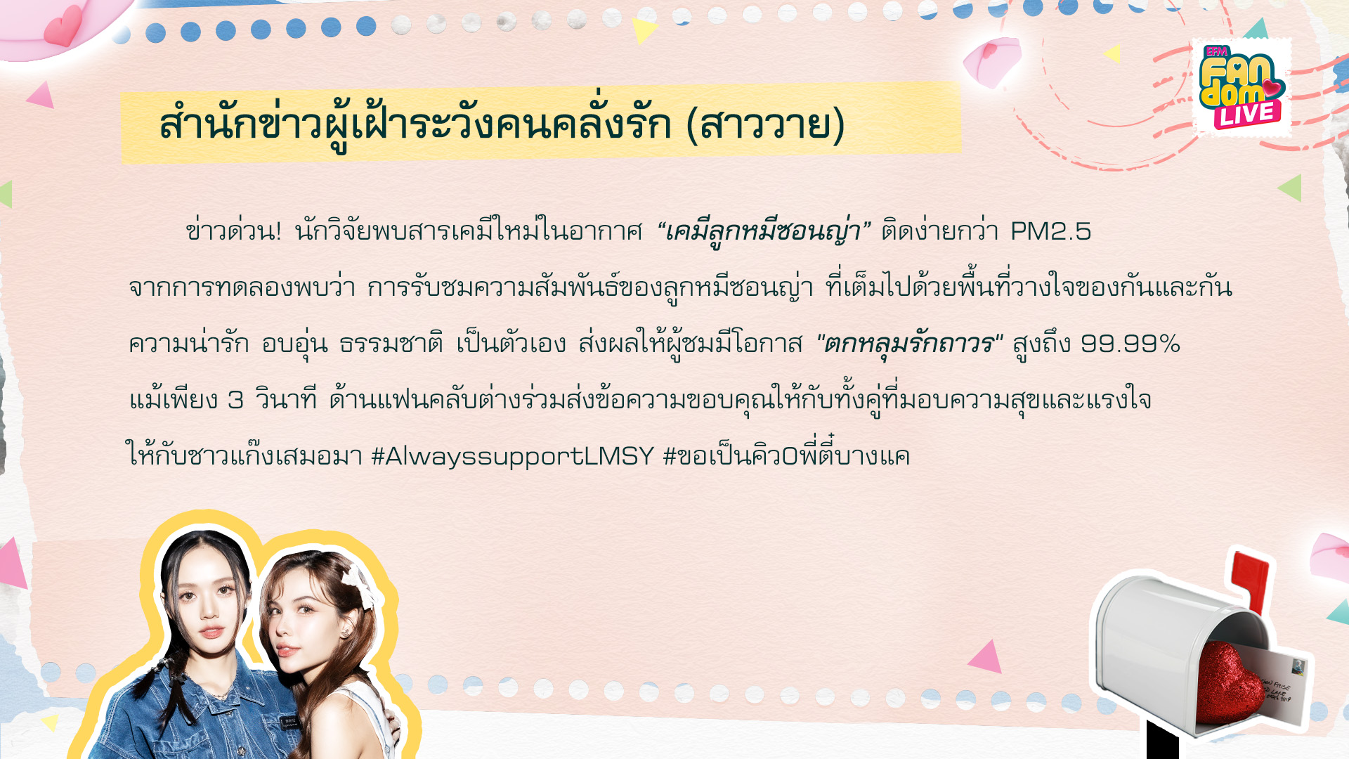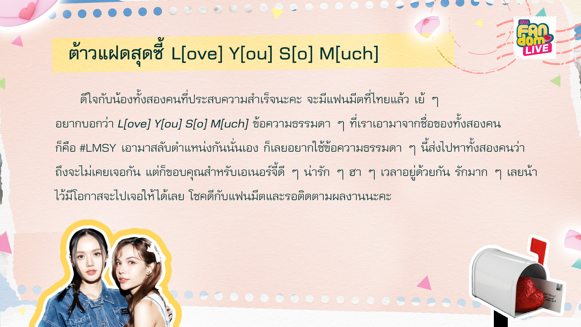 ดีใจกับน้องทั้งสองคนที่ประสบความสำเร็จนะคะ จะมีแฟนมีตที่ไทยแล้ว เย้ๆ อยากบอกว่า L[ove] Y[ou] S[o] M[uch] ข้อความธรรมดาๆ ที่เราเอามาจากชื่อของทั้งสองคน ก็คือ #LMSY เอามาสลับตำแหน่งกันนั่นเอง ก็เลยอยากใช้ข้อความธรรมดาๆ นี้ส่งไปหาทั้งสองคนว่า ถึงจะไม่เคยเจอกัน แต่ก็ขอบคุณสำหรับเอเนอร์จี้ดีๆ น่ารักๆ ฮาๆ เวลาอยู่ด้วยกัน รักมากๆ เลยน้า ไว้มีโอกาสจะไปเจอให้ได้เลย โชคดีกับแฟนมีตและรอติดตามผลงานนะคะ