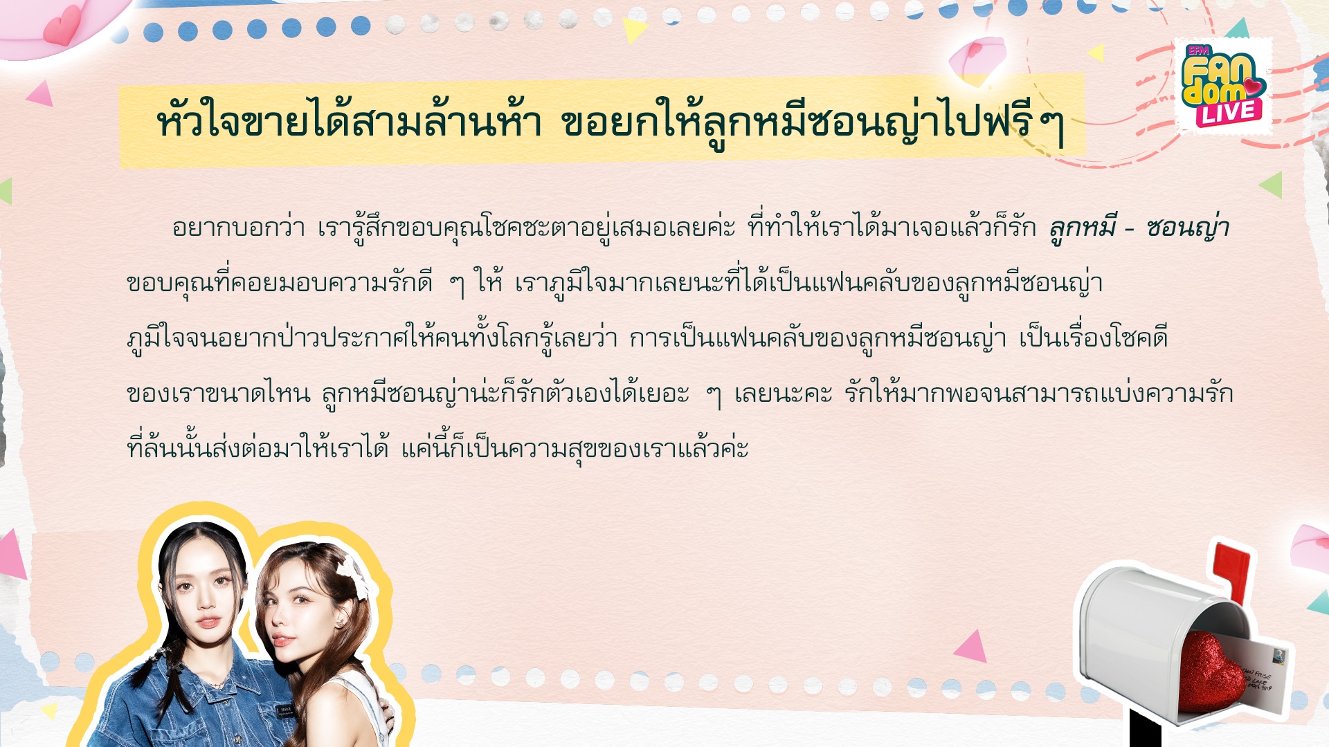 สุดท้ายนี้... รายการ EFM FANDOM LIVE ขอขอบคุณ “ลูกหมี – ซอนญ่า” มากๆเลยน้าที่มาร่วมพูดคุย สร้างสีสัน ความน่ารัก สร้างความสนุก ความสุขให้กับแฟนๆ และอย่าลืมไปดูทั้งคู่เดินสับๆกันใน LMSY 1st Fan Meeting in Thailand "Be My Valentine" วันเสาร์ ที่ 15 กุมภาพันธ์นี้ ที่ TRUE ICON HALL 7th FLOOR, ICONSIAM และฝากผลงานในฐานะศิลปินหญิงคู่แรกของ CHANGE 2561 กับเพลง 'พื้นที่วางใจ (MY SAFE ZONE)' และ 'เปล่าหวง (Jealous)' ไว้ด้วยน้าาา