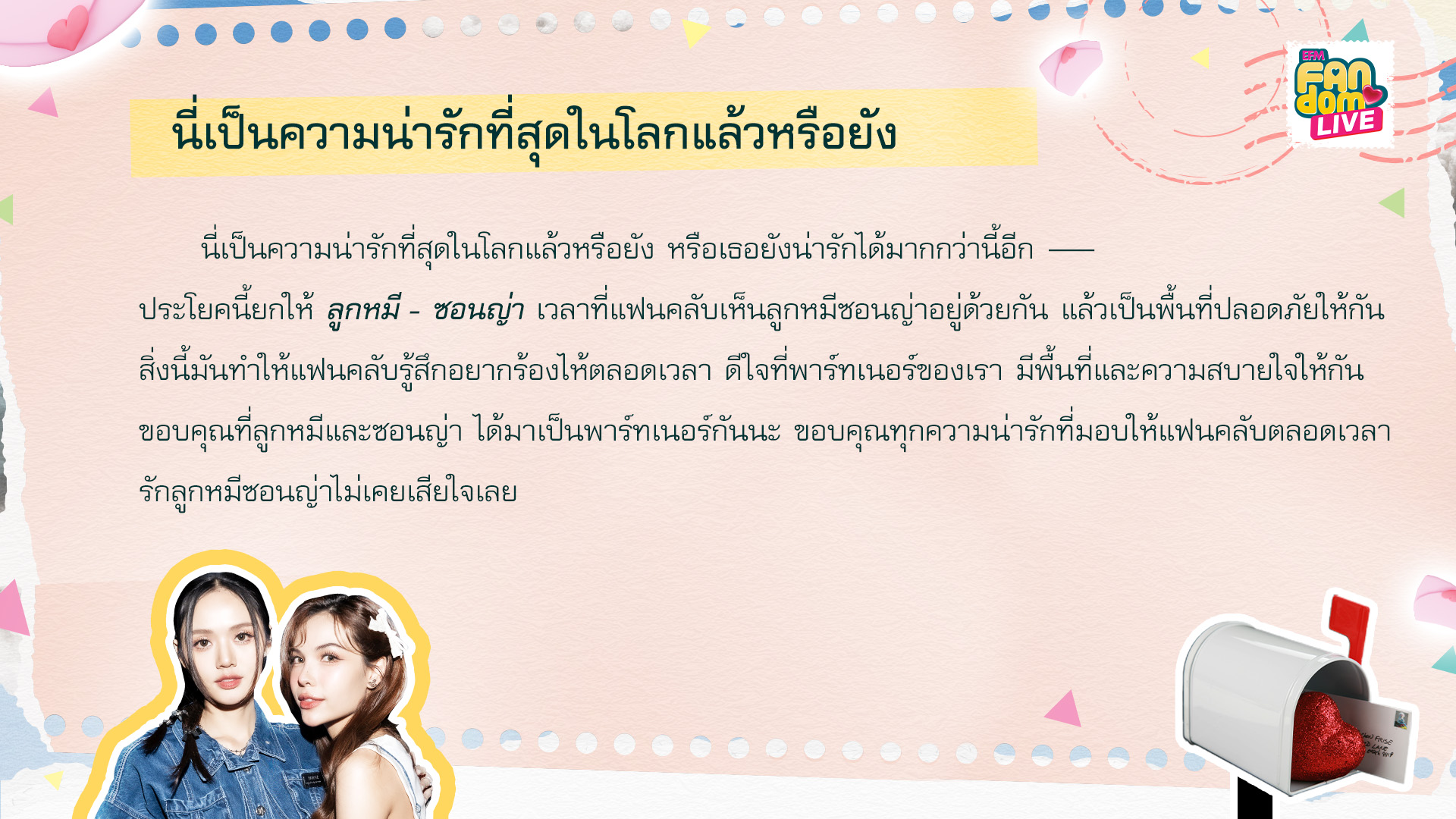 Congratulations to both of you on your amazing achievement! I’m so excited about the upcoming fan meeting in Thailand—how wonderful! I want to share a heartfelt message, L[ove] Y[ou] S[o] M[uch] , which creatively combines parts of your names. Even though we've never met, I truly appreciate the good vibes, cuteness, and humor you bring when we’re together. I adore both of you so much, and I hope to meet you someday. Wishing you tons of luck with the fan meeting, and I can't wait to see more of your wonderful work!