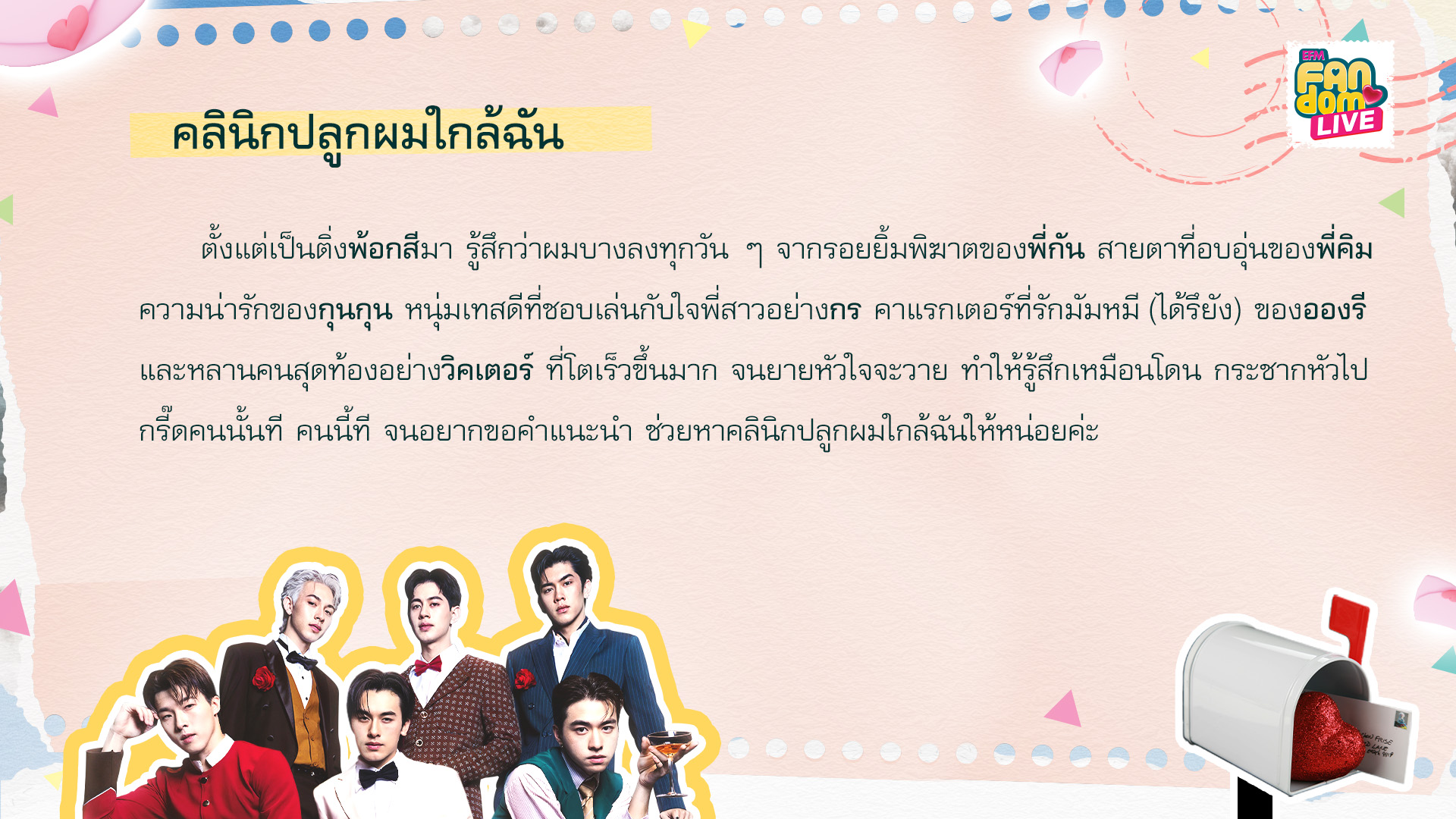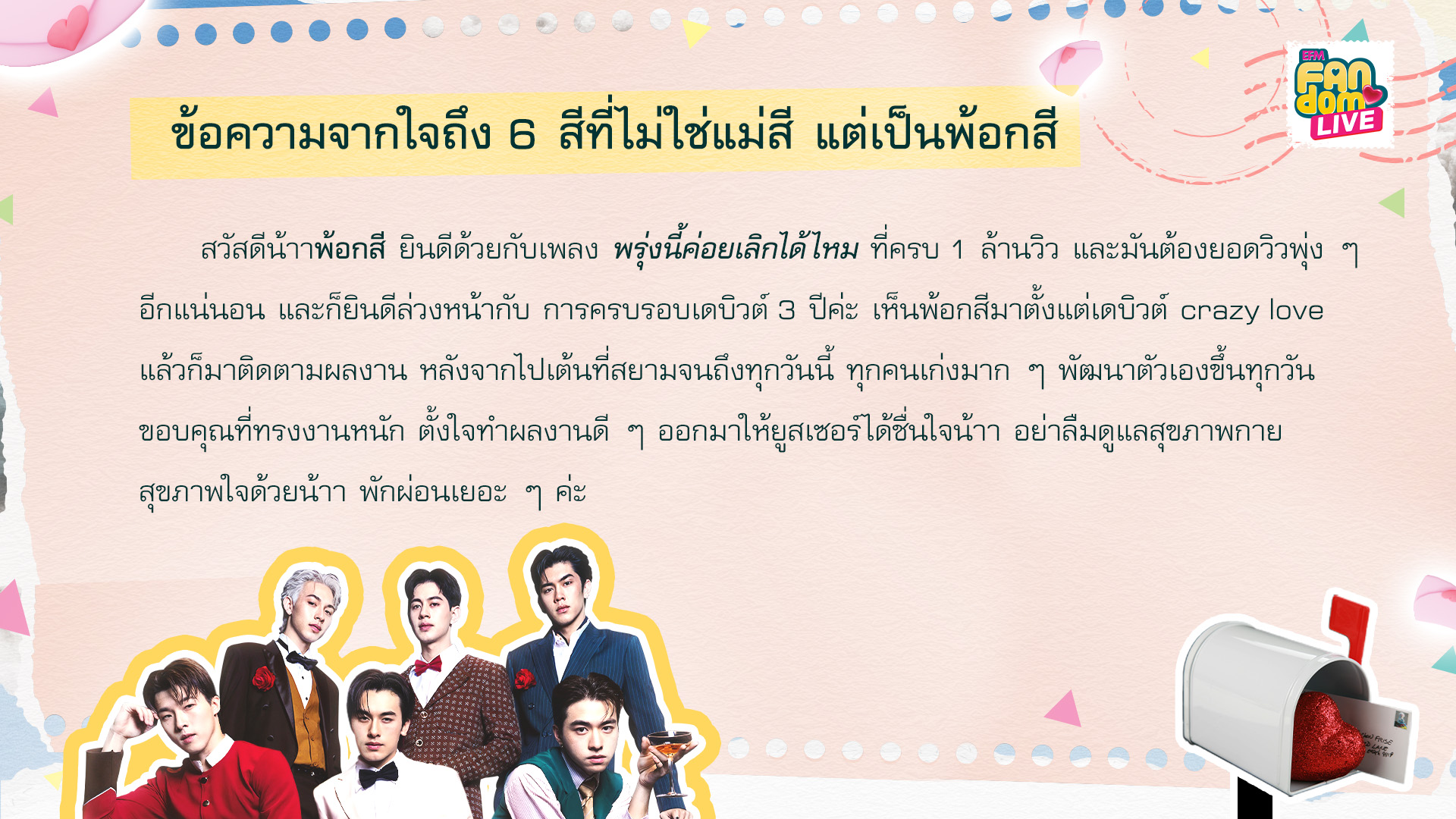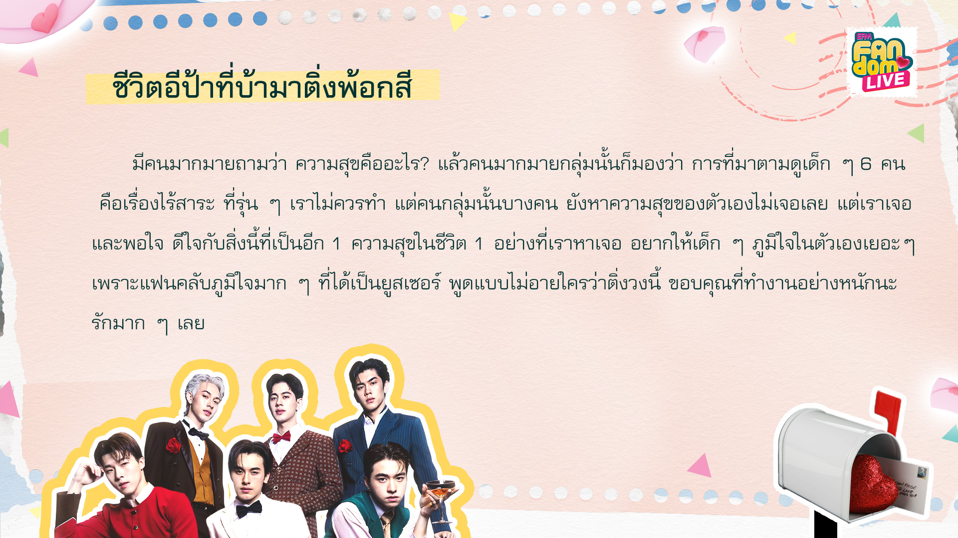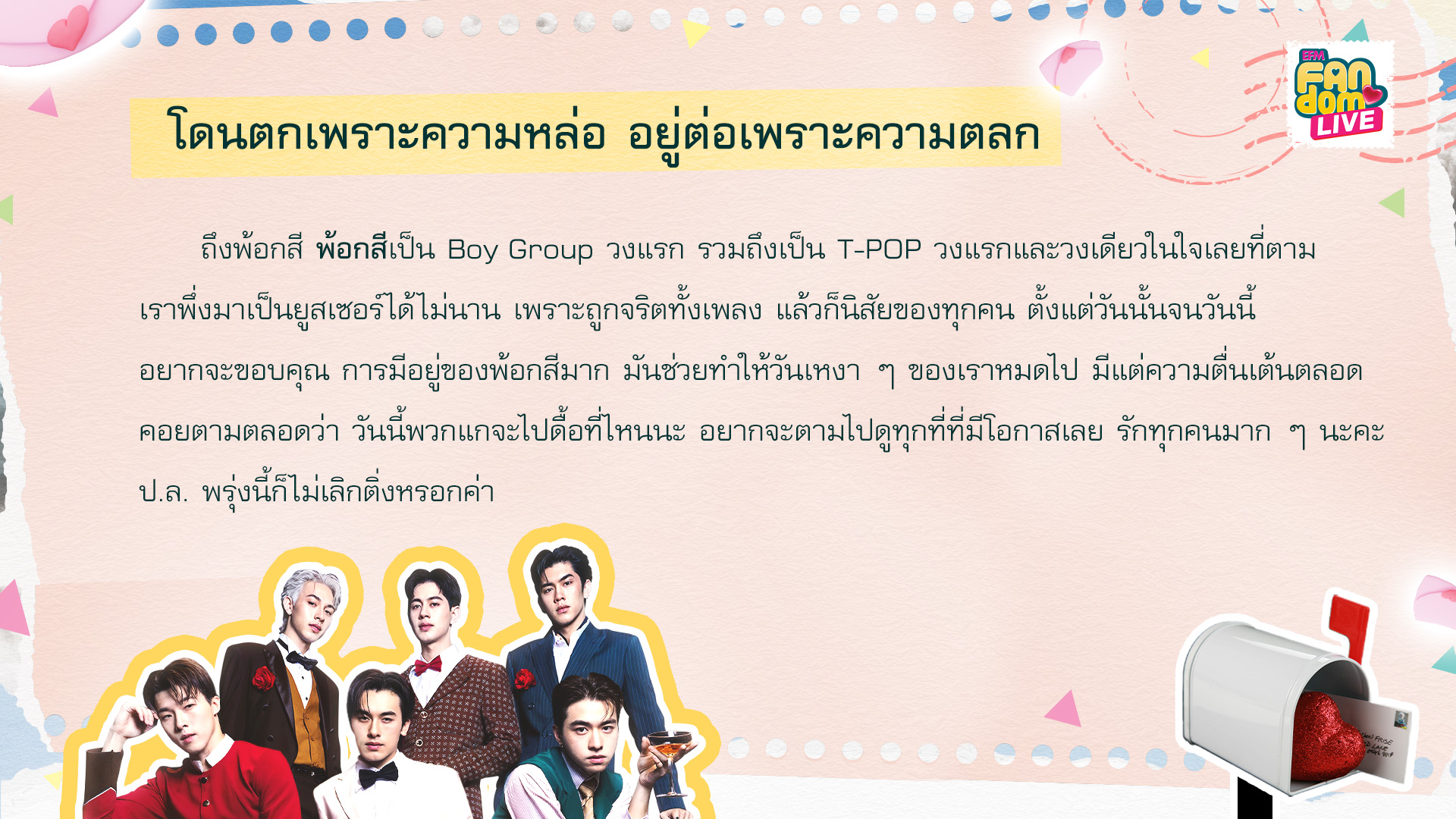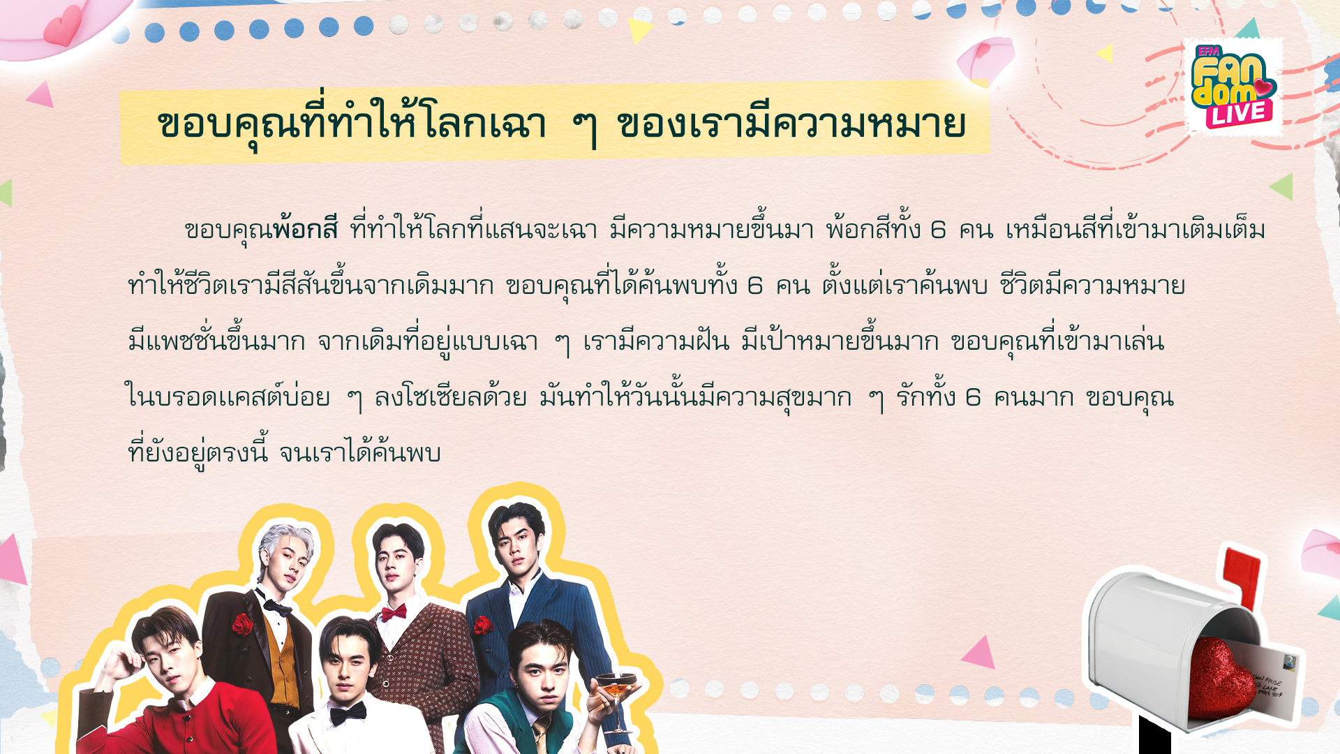 รายการ EFM FANDOM LIVE [20 กุมภาพันธ์ 68] คืนนี้พร้อมต้อนรับ 2 หนุ่มสุดฮอต “บอส - โนอึล” จากซีรีส์ The Boy Next World คนละกาลเวลา พร้อมพูดคุยเม้าท์มอยกับ 2 ดีเจคู่ซี้ “ดีเจโซเซฟ” และ “ดีเจแนน”ในช่วงแรกของรายการ พี่ๆดีเจอ่าน 5 จดหมาย “EFM FANDOM LOVE LETTERS”ที่ถูกเลือกมาจากแฟนๆส่งความในใจที่อยากจะบอกศิลปินเข้ามาจดหมายฉบับที่ 1 ชื่อจดหมายว่า... จดหมายรักนี้อยู่ภายใต้ดวงอาทิตย์ดวงเดียวกัน ที่มาของชื่อจดหมายนี้เพราะ บอส – โนอึล เป็นเหมือนความอบอุ่น ความส่องแสงนำทาง เป็นเหมือนศูนย์กลางของหัวใจโบโน่ห์ ชื่อ 2 คนนี้มีความหมายกับเรามาก เราไม่เคยเข้าใจเลยว่าทำไมการมีศิลปินคนโปรดถึงมีอิทธิพล จนถึงมาเจอบอสกับโนอึล แค่สบตาเหมือนต่อชีวิตได้อีกพันปี ขอบคุณจังหวะชีวิตมากๆที่ได้ทำให้มารู้จักกัน เราชอบทุกอย่างที่เป็นบอสโนอึลนะ you are my yesterday and tomorrow รักนะคะ ทำได้ดีมากแล้วนะ เก่งมากเลยLetter #1: This letter is titled... This love letter shines brightly beneath the same sun. The name of this letter comes from the fact that Boss and Noeul bring warmth and serve as a guiding light—they're at the very heart of BoNoH. Their names carry a lot of meaning for us. We never really grasped how much a favorite artist could impact us until we met Boss and Noeul. Just gazing into each other's eyes feels like it expands our lives for another thousand years. We're really grateful to life for bringing us together. We truly appreciate everything about Boss and Noeul. You are my past and my future. Love you both—great job, you two! You're incredible.จดหมายฉบับที่ 2 ชื่อจดหมายว่า... นี่คือสารจากคนที่มีความสุขที่สุด อยากบอกว่าหนูมีความสุขมาก พี่เป็นความสุขของหนู ถ้าหนูไม่อยู่ตรงนี้ก็ไม่รู้จะได้มาทำอะไรแบบนี้รึป่าว มันจริงอย่างที่เขาบอกจริงๆว่า ถ้าเราไม่เป็นติ่ง เงินเราจะเต็มกระเป๋า แต่หัวใจเราจะว่างเปล่า พี่ชอบบอกว่าจะเป็นคนที่เก่งขึ้นและพัฒนาตัวเองขึ้นทุกวัน แต่หนูว่าพี่ไม่ต้องเก่งขึ้นทุกวันก็ได้ อยากให้พี่มีความสุขทุกวันใช้ชีวิตแบบที่ตัวเองอยากจะใช้ ถ้าพี่บอกว่าพี่จะเป็นความสุขให้เรา พี่ทำสำเร็จแล้วนะ รักนะLetter #2: This letter is titled... This is a note from someone who’s really happy. I just want to share how truly happy I am. You bring me so much joy. Honestly, if I weren’t here, I’m not sure I could manage it. It is really true what they say : without passion, we might have money, but our hearts would feel empty. You often mention wanting to improve yourself and grow each day. But I believe it’s not about getting better every single day. What matters most is your happiness and living your life the way you choose. If you say you're going to be our happiness, then you've already achieved it. I love you.จดหมายฉบับที่ 3 ชื่อจดหมายว่า... Heal the Heart (ไอ่ต้าวขุมพลังใจ) ขอบคุณ บอส - โนอึล ที่ไม่เคยหยุดพัฒนาตัวเองเลย ตลอด 3 ปีที่ตาม บอสโนอึลเก่งขึ้นมากๆ เก่งขึ้นทุกปี ขอบคุณที่อยู่ตรงนี้ ขอบคุณที่ฮีลใจกันมาตลอด ไม่ว่าจะแตกสลายกับอะไรมากี่ครั้ง บอสโนอึลประกอบขึ้นใหม่ทุกครั้งเลย และทุกครั้งที่ไปเจอ น้องก็จะพยายามกวาดสายตามองแฟนคลับให้ครบทุกคน เก็บทุกกล้องมันมีความหมายมาก สุดท้ายนี้อยากจะบอกว่า จะคอยซัพพอร์ตอยู่ตรงนี้เสมอนะ อยากทำอะไรทำได้เลย ทุกคนพร้อมสู้ไปกับบ