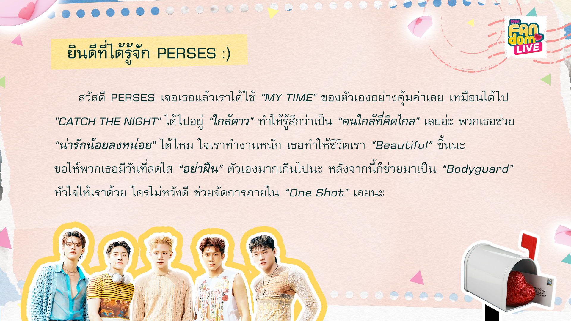 สวัสดี PERSES เจอเธอแล้วเราได้ใช้ "MY TIME" ของตัวเองอย่างคุ้มค่าเลย เหมือนได้ไป "CATCH THE NIGHT" ได้ไปอยู่ “ใกล้ดาว” ทำให้รู้สึกว่าเป็น “คนใกล้ที่คิดไกล” เลยอ่ะ พวกเธอช่วย “น่ารักน้อยลงหน่อย" ได้ไหม ใจเราทำงานหนัก เธอทำให้ชีวิตเรา “Beautiful” ขึ้นนะ ขอให้พวกเธอมีวันที่สดใส “อย่าฝืน” ตัวเองมากเกินไปนะ หลังจากนี้ก็ช่วยมาเป็น “Bodyguard” หัวใจให้เราด้วย ใครไม่หวังดี ช่วยจัดการภายใน “One Shot” เลยนะ