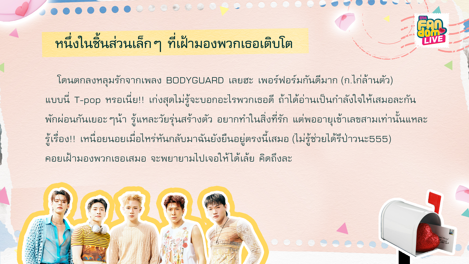 I absolutely loved the song ‘BODYGUARD’. The performance was amazing! Is this T-pop? Honestly, I'm not sure what to say. But if you're reading this, please know that I’m always here to support you. Make sure to get enough rest. I understand that as teenagers, you want to carve your own path and follow your passions, but once you hit your thirties, you'll get it! Whenever you're feeling tired or down, just look for me—I’ll be right here for you (I'm not sure if this will be helpful or not, haha). I’ll always be keeping an eye on you, and I’ll do my best to come see you. I really miss you.