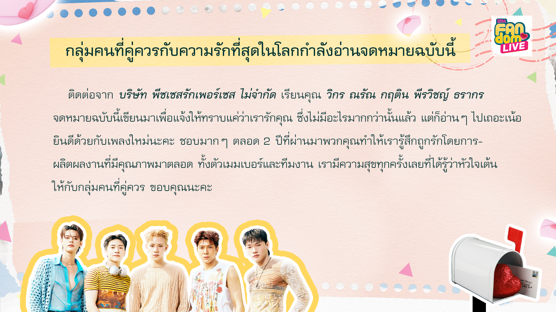 ติดต่อจาก บริษัท พีซเซสรักเพอร์เซส ไม่จำกัด เรียนคุณ วิกร ณรัณ กฤติน พีรวิชญ์ ธรากร จดหมายฉบับนี้เขียนมาเพื่อแจ้งให้ทราบแค่ว่าเรารักคุณ ซึ่งไม่มีอะไรมากกว่านั้นแล้ว แต่ก็อ่านๆไปเถอะเน้อ ยินดีด้วยกับเพลงใหม่นะคะ ชอบมากๆ ตลอด 2 ปีที่ผ่านมาพวกคุณทำให้เรารู้สึกถูกรักโดยการผลิตผลงานที่มีคุณภาพมาตลอด ทั้งตัวเมมเบอร์และทีมงาน เรามีความสุขทุกครั้งเลยที่ได้รู้ว่าหัวใจเต้นให้กับกลุ่มคนที่คู่ควร ขอบคุณนะคะ