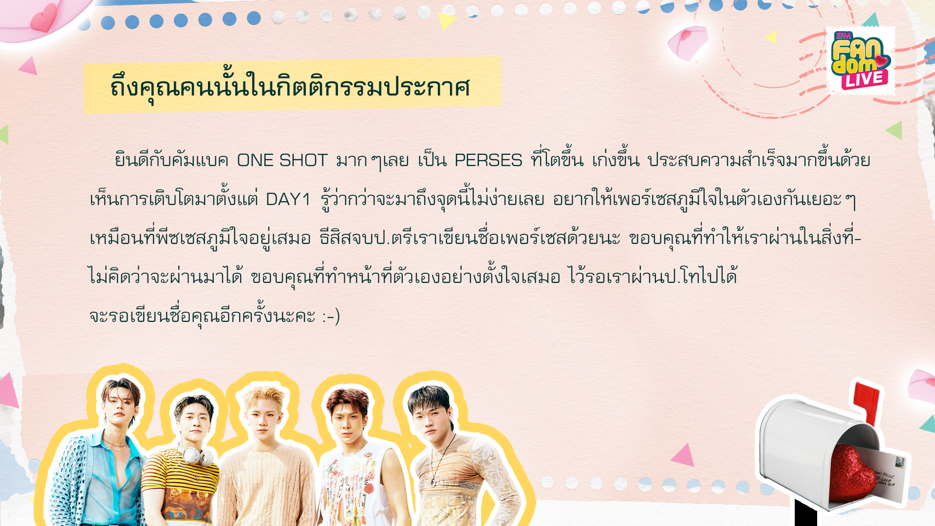 ยินดีกับคัมแบค ONE SHOT มากๆเลย เป็น PERSES ที่โตขึ้น เก่งขึ้น ประสบความสำเร็จมากขึ้นด้วย เห็นการเติบโตมาตั้งแต่ DAY1 รู้ว่ากว่าจะมาถึงจุดนี้ไม่ง่ายเลย อยากให้เพอร์เซสภูมิใจในตัวเองกันเยอะๆ เหมือนที่พีซเซสภูมิใจอยู่เสมอ ธีสิสจบป.ตรีเราเขียนชื่อเพอร์เซสด้วยนะ ขอบคุณที่ทำให้เราผ่านในสิ่งที่ไม่คิดว่าจะผ่านมาได้ ขอบคุณที่ทำหน้าที่ตัวเองอย่างตั้งใจเสมอ ไว้รอเราผ่านป.โทไปได้ จะรอเขียนชื่อคุณอีกครั้งนะคะ :-)