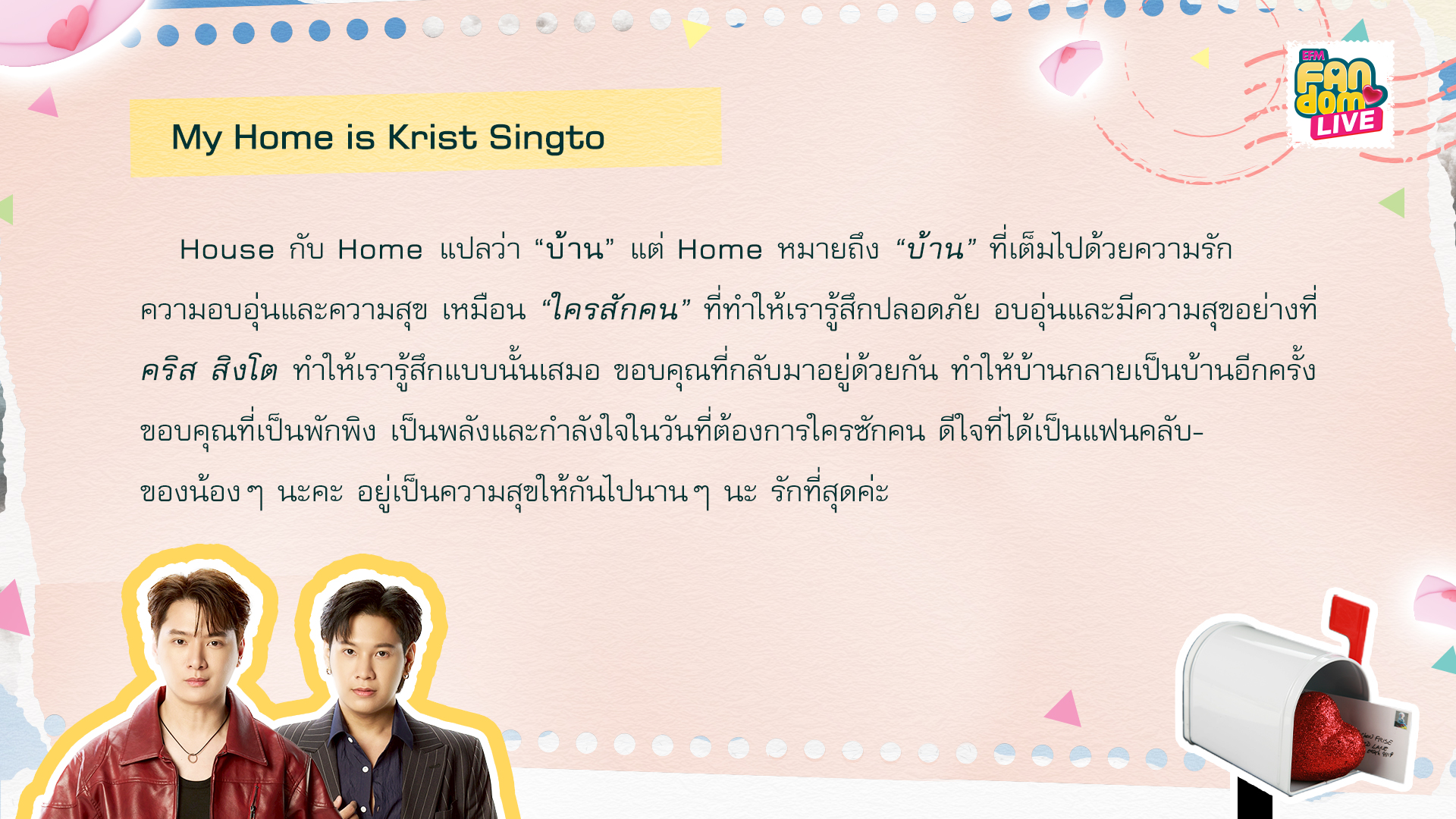 House and home both refer to a place we live, but home is so much more—it's filled with love, warmth, and happiness. It's like those special people in our lives who make us feel safe and joyful, just as Krist and Singto do for us. I can't thank you enough for coming back and turning our house into a home once more. You've provided us with comfort, strength, and encouragement when we've needed it most. I'm truly grateful to be a fan of you both. I hope you continue to support and cherish each other for a long time. Sending you all my love.