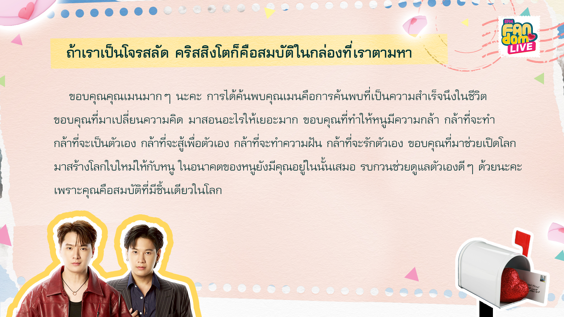 Dear Krist and Singto, from our time with SOTUS to The Ex-Morning, we've shared countless wonderful moments. I truly appreciate the passion you put into your work, which brings so much joy to fans like me and fills us with pride. You have both remained the same lovely, humble, gentle, and sincere individuals since the first day we met, and that means a lot. I wish you both great success in whatever you pursue going forward. My support will always be with you because my love for you has never wavered.