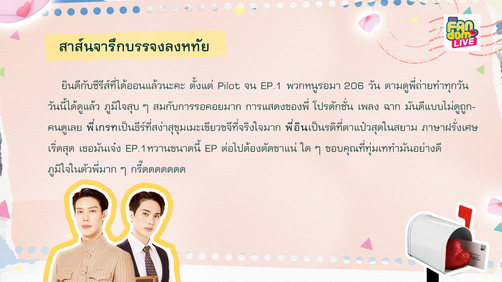 ยินดีกับซีรีส์ที่ได้ออนแล้วนะคะ ตั้งแต่ Pilot จน EP.1 พวกหนูรอมา 206 วัน ตามดูพี่ถ่ายทำทุกวัน วันนี้ได้ดูแล้ว ภูมิใจสุบๆสมกับการรอคอยมาก การแสดงของพี่ โปรดักชั่น เพลง ฉาก มันดีแบบไม่ดูถูกคนดูเลย พี่เกรทเป็นธีร์ที่สง่าสุขุมเมะเขียวขจีที่จริงใจมาก พี่อินเป็นรติที่ตาแป๋วสุดในสยาม ภาษาฝรั่งเศษเริ่ดสุด เธอมันเจ๋ง EP.1หวานขนาดนี้ EP ต่อไปต้องตัดขาแน่ ใดๆขอบคุณที่ทุ่มเททำมันอย่างดี ภูมิใจในตัวพี่มากๆ กรี๊ดดดดดดด