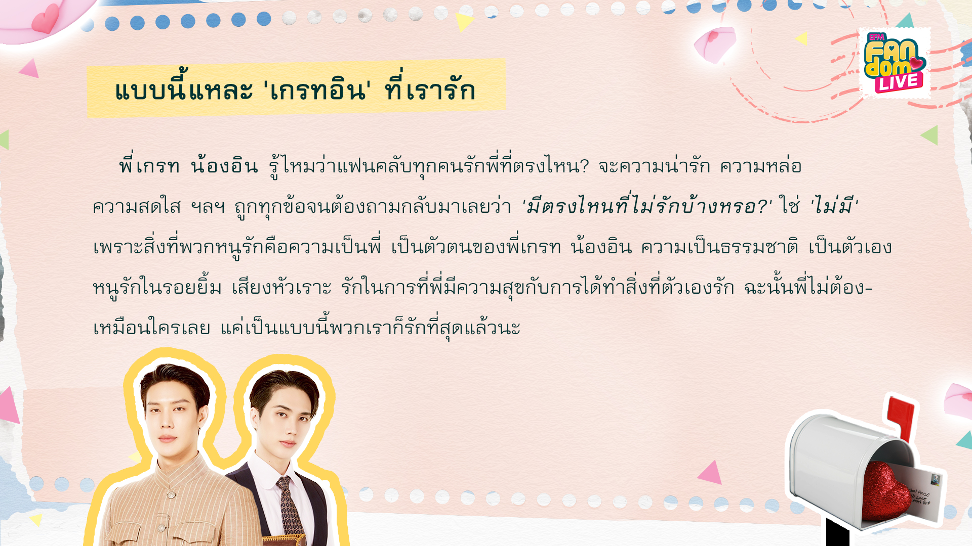 พี่เกรท น้องอิน รู้ไหมว่าแฟนคลับทุกคนรักพี่ที่ตรงไหน? จะความน่ารัก ความหล่อ ความสดใส ฯลฯ ถูกทุกข้อจนต้องถามกลับมาเลยว่า 'มีตรงไหนที่ไม่รักบ้างหรอ?' ใช่ 'ไม่มี' เพราะสิ่งที่พวกหนูรักคือความเป็นพี่ เป็นตัวตนของพี่เกรท น้องอิน ความเป็นธรรมชาติ เป็นตัวเอง หนูรักในรอยยิ้ม เสียงหัวเราะ รักในการที่พี่มีความสุขกับการได้ทำสิ่งที่ตัวเองรัก ฉะนั้นพี่ไม่ต้องเหมือนใครเลย แค่เป็นแบบนี้พวกเราก็รักที่สุดแล้วนะ