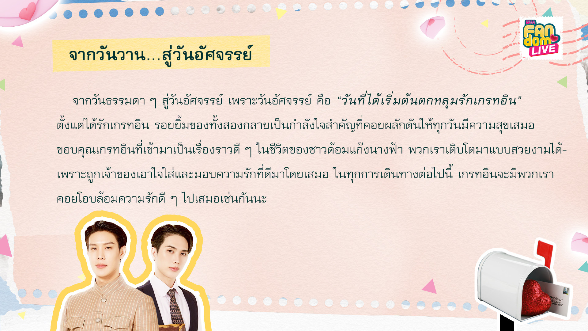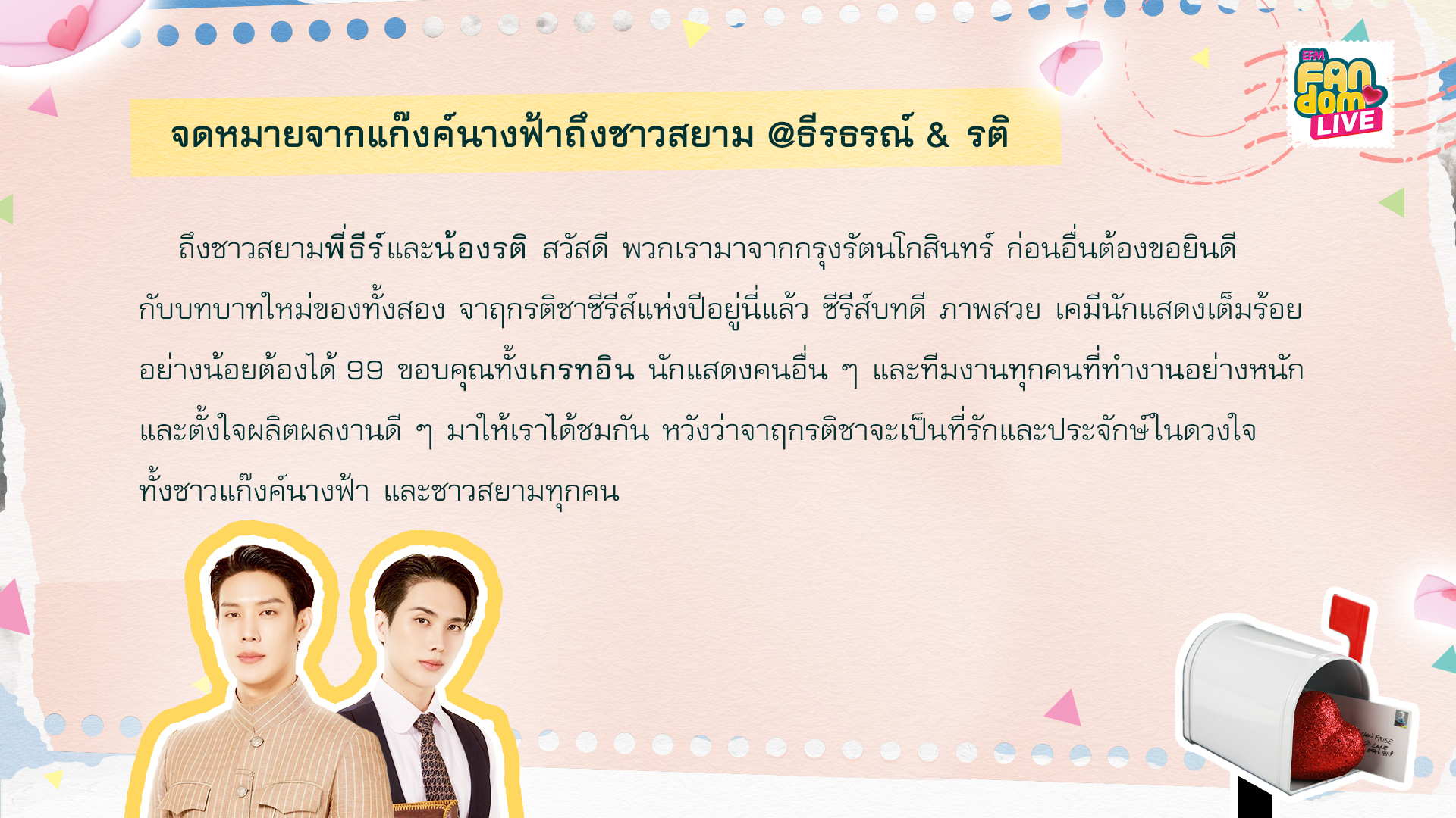 Hello to the Siamese duo, P' Thee and N' Rati! We're reaching out from Rattanakosin. First off, huge congratulations on your new positions! The much-anticipated series, 'Memoir of Rati,’ has finally arrived. It features a fantastic script, stunning visuals, and an undeniable chemistry among the actors—at least 99%, if not 100%! A big thank you to Great Inn, the entire cast, and all the hardworking staff who dedicated themselves to creating this wonderful show for us. I truly hope that 'Memoir of Rati' finds a special place in the hearts of both the angel gang and all the people of Siam.