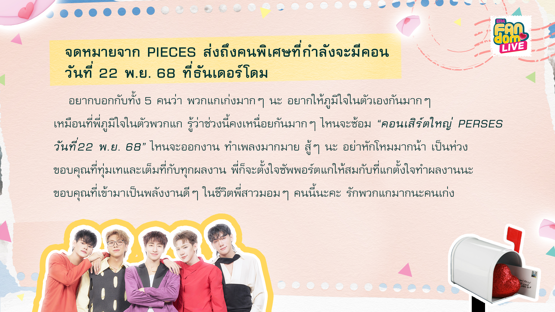 จดหมายฉบับที่ 4 ชื่อจดหมายว่า... จดหมายจาก PIECES ส่งถึงคนพิเศษที่กำลังจะมีคอนวันที่ 22 พ.ย. 68 ที่ธันเดอร์โดม