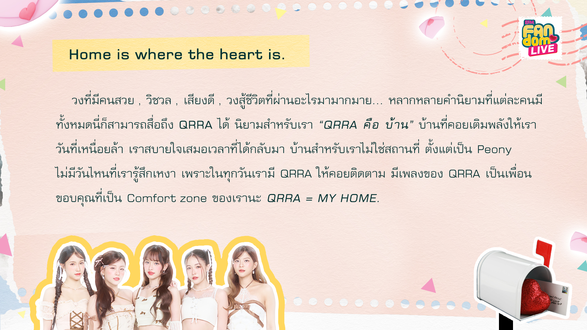 วงที่มีคนสวย , วิชวล , เสียงดี , วงสู้ชีวิตที่ผ่านอะไรมามากมาย... หลากหลายคำนิยามที่แต่ละคนมี ทั้งหมดนี่ก็สามารถสื่อถึง QRRA ได้ นิยามสำหรับเรา “QRRA คือ บ้าน” บ้านที่คอยเติมพลังให้เราวันที่เหนื่อยล้า เราสบายใจเสมอเวลาที่ได้กลับมา บ้านสำหรับเราไม่ใช่สถานที่ ตั้งแต่เป็น Peony ไม่มีวันไหนที่เรารู้สึกเหงา เพราะในทุกวันเรามี QRRA ให้คอยติดตาม มีเพลงของ QRRA เป็นเพื่อน ขอบคุณที่เป็น Comfort zone ของเรานะ QRRA = MY HOME.