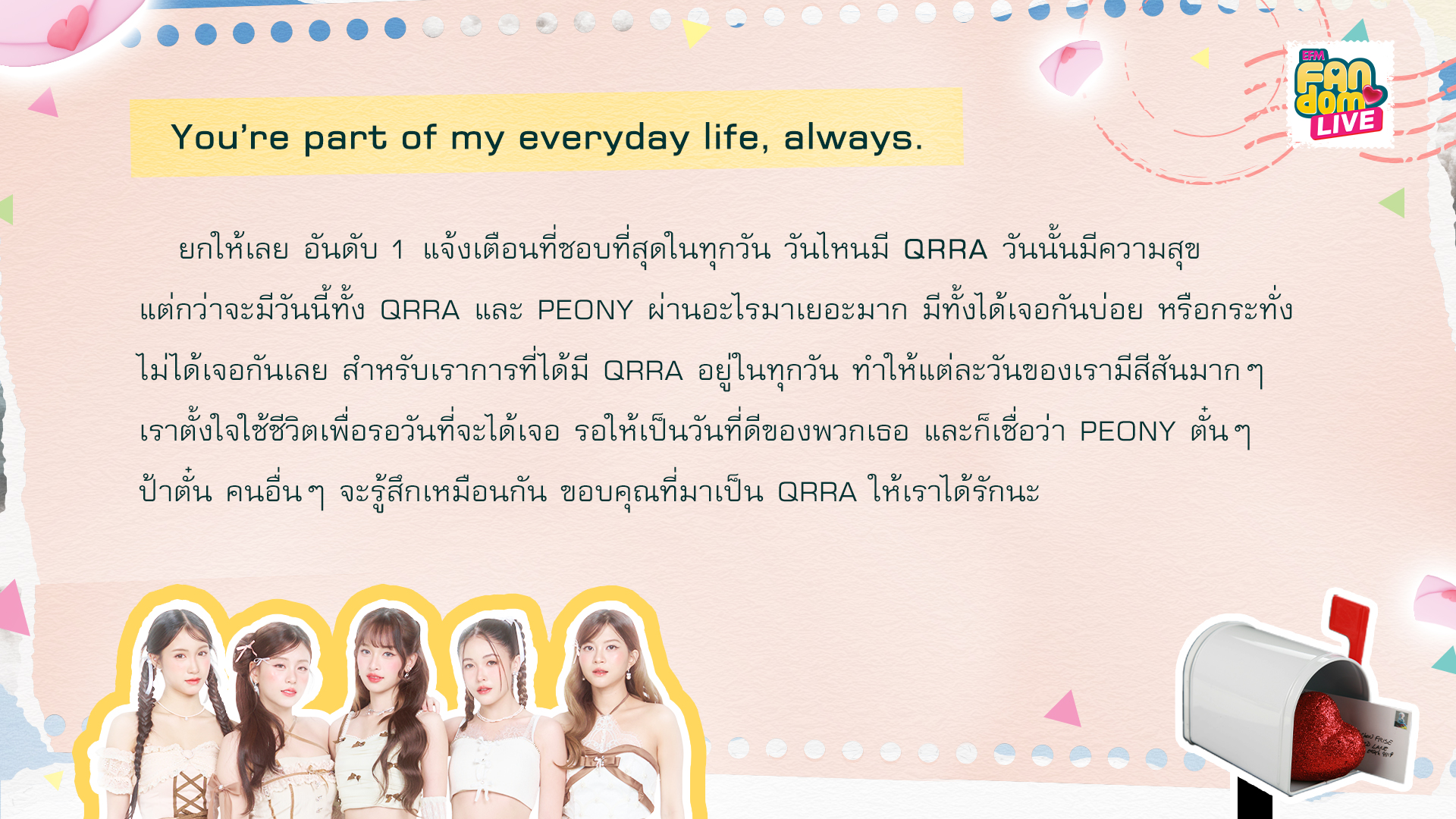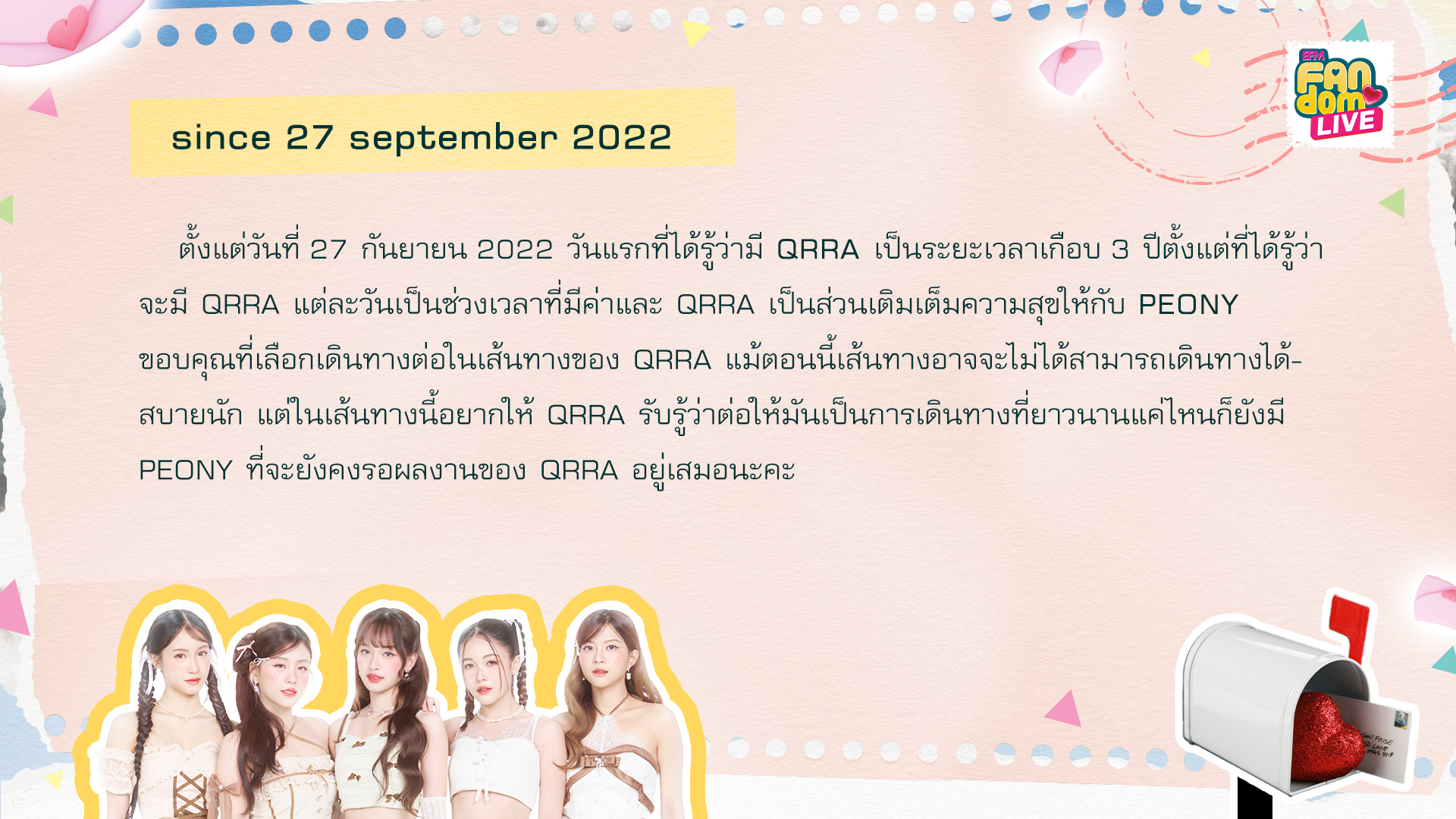ตั้งแต่วันที่ 27 กันยายน 2022 วันแรกที่ได้รู้ว่ามี QRRA เป็นระยะเวลาเกือบ 3 ปีตั้งแต่ที่ได้รู้ว่าจะมี QRRA แต่ละวันเป็นช่วงเวลาที่มีค่าและ QRRA เป็นส่วนเติมเต็มความสุขให้กับ PEONY ขอบคุณที่เลือกเดินทางต่อในเส้นทางของ QRRA แม้ตอนนี้เส้นทางอาจจะไม่ได้สามารถเดินทางได้สบายนัก แต่ในเส้นทางนี้อยากให้ QRRA รับรู้ว่าต่อให้มันเป็นการเดินทางที่ยาวนานแค่ไหนก็ยังมี PEONY ที่จะยังคงรอผลงานของ QRRA อยู่เสมอนะคะ