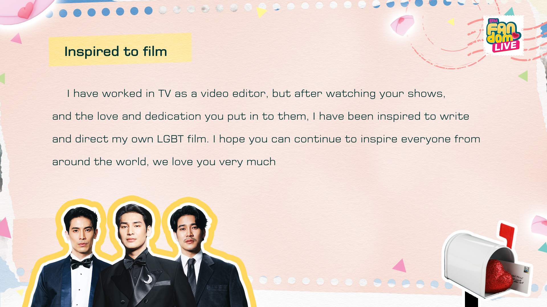 “EFM FANDOM LOVE LETTERS” ที่ถูกเลือกมาจากแฟน ๆ ส่งความในใจที่อยากจะบอกกับศิลปิน