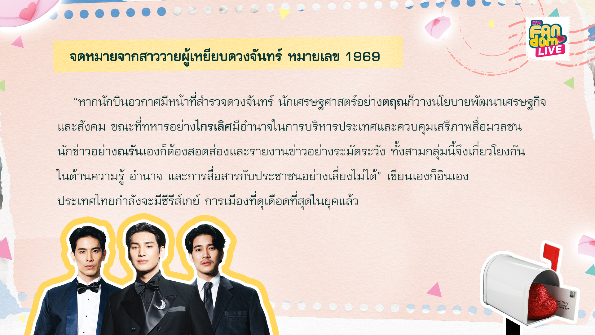 "If astronauts are sent to explore the moon, economists like Trin will be in charge of creating economic and social policies. Meanwhile, soldiers like Krailert are given the authority to govern the nation and oversee press freedom, and journalists like Naran take on the crucial role of diligently tracking and reporting the news. These three groups are deeply interconnected when it comes to knowledge, power, and how they communicate with the public." On a personal note, I'm really invested in this. Thailand is on the brink of experiencing one of the most intense political movements related to the LGBTQ+ community in its history.