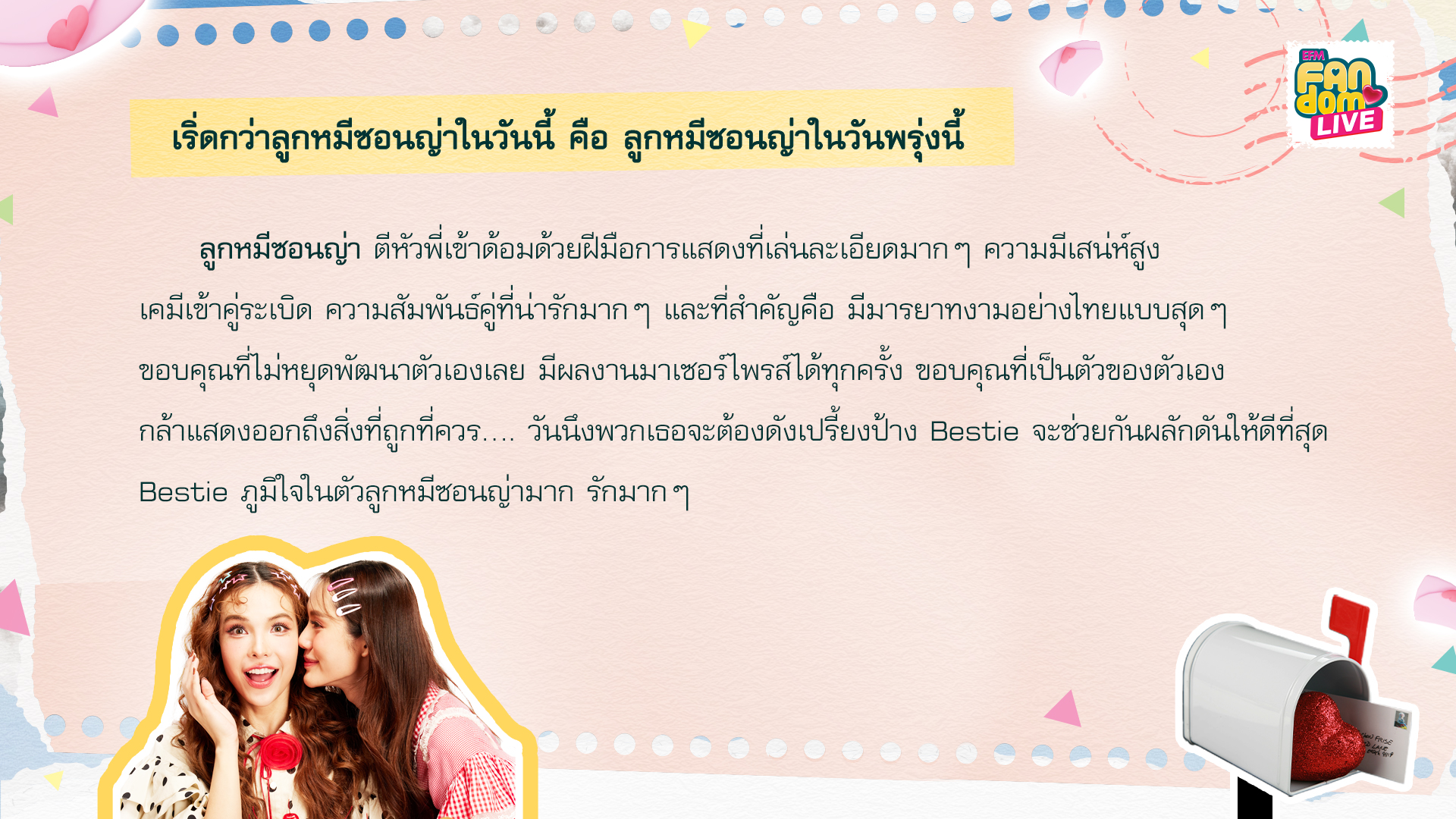 Lookmhee Sonya, you have completely captivated me with your precise acting talents, undeniable charm, and that vibrant chemistry you share. Your adorable relationship just adds to the allure, and I am especially impressed by your wonderfully Thai grace. I’m grateful that you continuously seek to grow and refine your craft; your performances consistently surprise me. Thank you for staying true to yourself and boldly voicing what’s right and just. I believe that one day, you'll achieve great fame. Rest assured, Bestie will be right there to champion your journey to greatness. Bestie beams with pride for Lookmhee Sonya. I love you dearly.