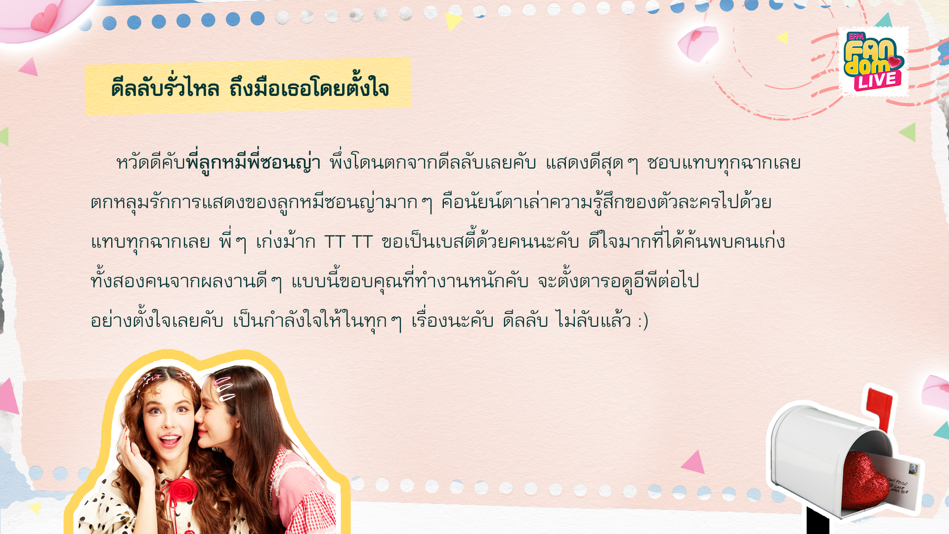 Hi P'Lookmhee and P'Sonya, I just finished watching Secret Deal, and I was truly impressed! Your performances are amazing—I loved almost every scene. P'Lookmhee Sonya, your way of expressing emotions through your eyes really brings the character to life. You both have such incredible talent! I wish I could be your bestie! I'm so glad I found two such skilled actors in this fantastic show. Thank you for all your hard work. I'm eagerly looking forward to the next episode and will be supporting you every step of the way. Secret Deal is definitely not a secret anymore! :)