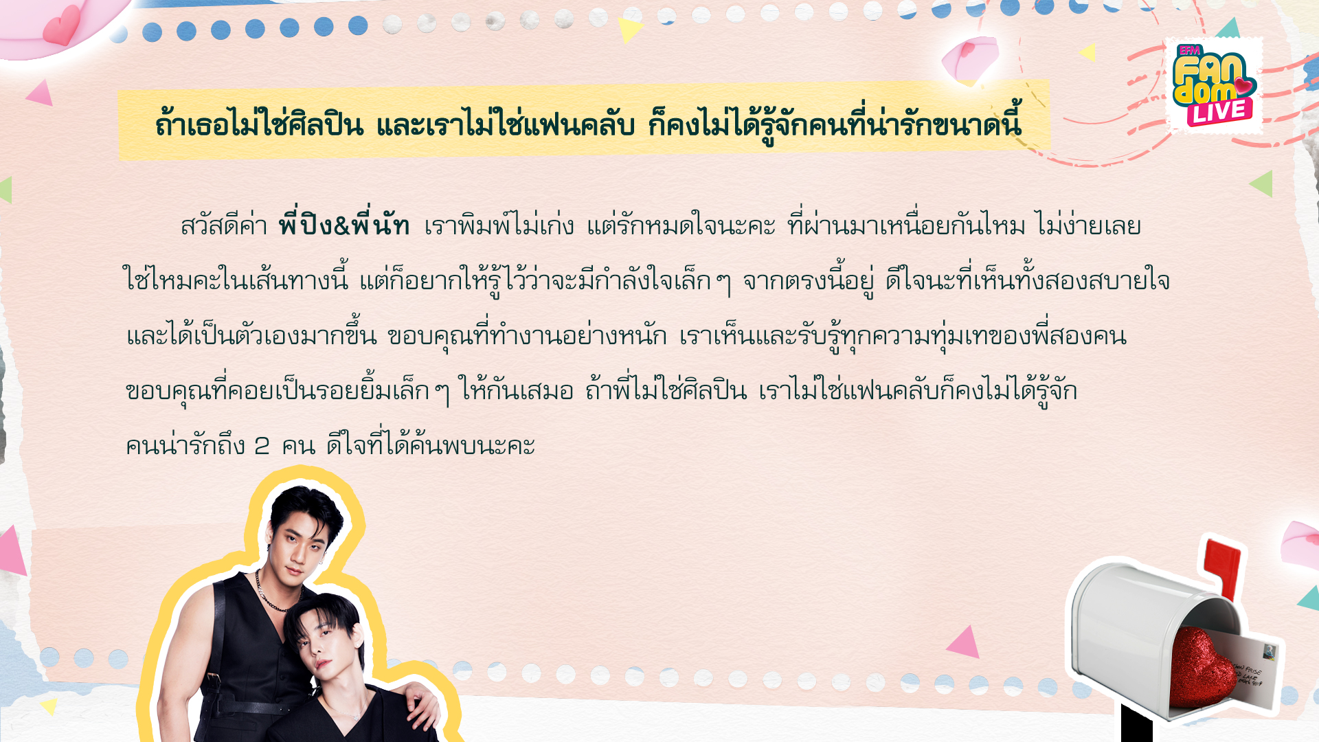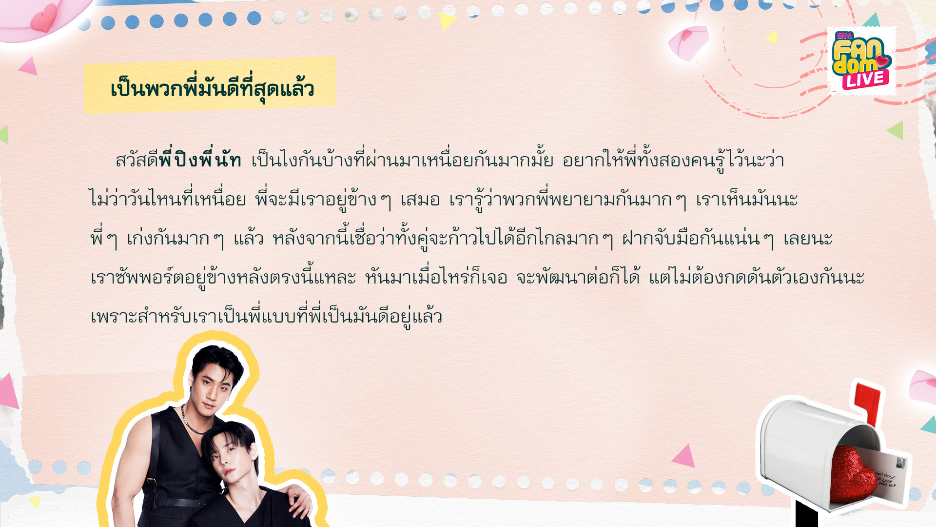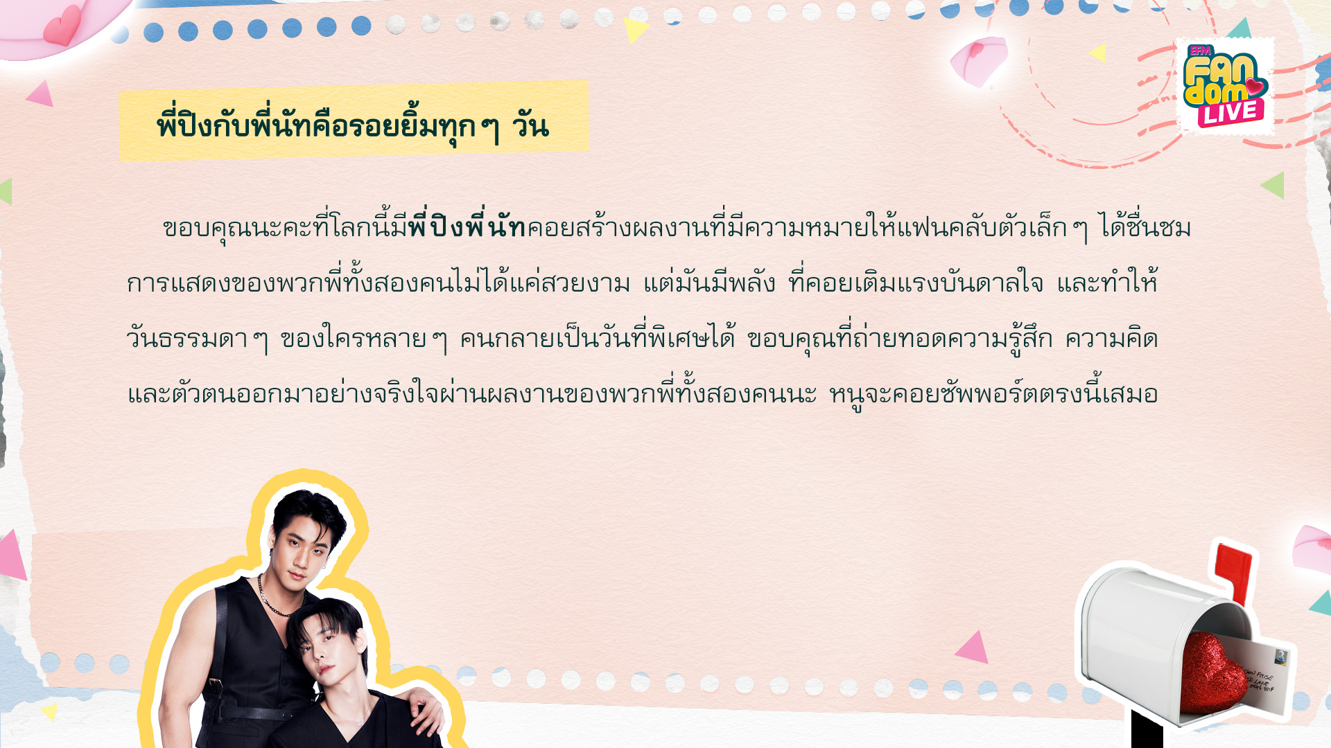 Hi, P'Ping and P'Nut. I'm not the best at typing, but I want you to know how much I care about you both. Have you been feeling tired lately? It’s been a tough time, hasn’t it? Just remember, I’m sending a bit of encouragement your way. It makes me so happy to see you both thriving and being your true selves. Thank you for all the effort you put in; we really notice and appreciate your dedication. I’m grateful for the way you bring smiles to each other's lives. If you weren’t artists and I wasn’t your fan, we might never have had the chance to meet such wonderful people. I'm so glad to have found you.