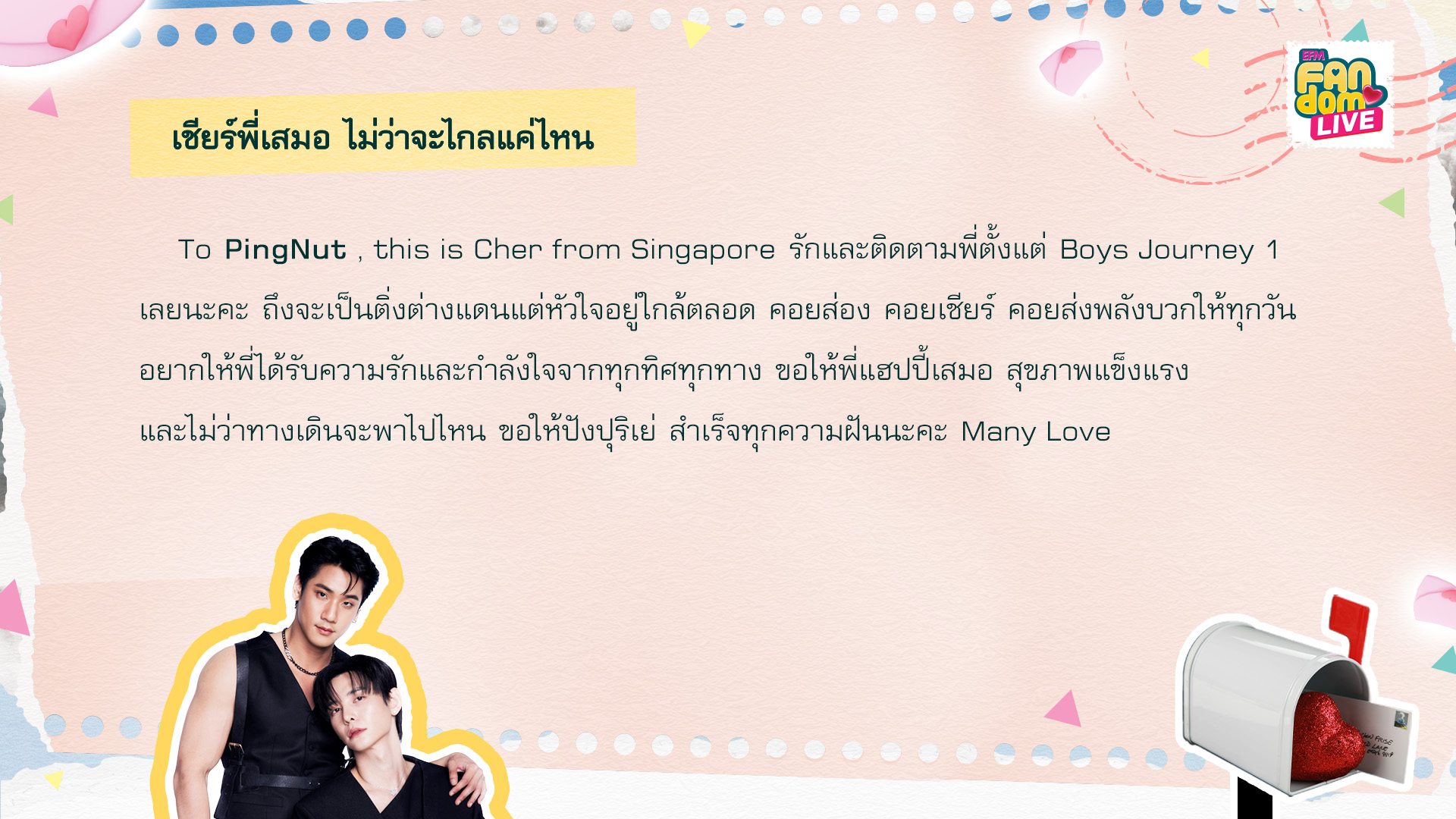 To PingNut , this is Cher from Singapore รักและติดตามพี่ตั้งแต่ Boys Journey 1 เลยนะคะ ถึงจะเป็นติ่งต่างแดนแต่หัวใจอยู่ใกล้ตลอด คอยส่อง คอยเชียร์ คอยส่งพลังบวกให้ทุกวัน อยากให้พี่ได้รับความรักและกำลังใจจากทุกทิศทุกทาง ขอให้พี่แฮปปี้เสมอ สุขภาพแข็งแรง และไม่ว่าทางเดินจะพาไปไหน ขอให้ปังปุริเย่ สำเร็จทุกความฝันนะคะ Many Love