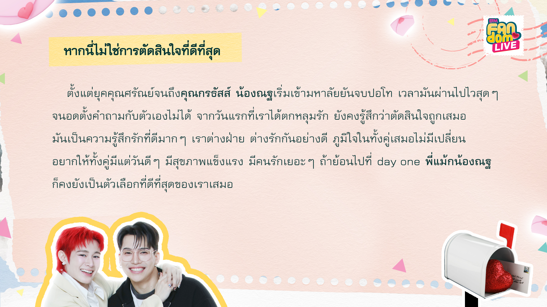ตั้งแต่ยุคคุณศรัณย์จนถึงคุณกรธัสส์ น้องณฐเริ่มเข้ามหาลัยยันจบปอโท เวลามันผ่านไปไวสุดๆ จนอดตั้งคำถามกับตัวเองไม่ได้ จากวันแรกที่เราได้ตกหลุมรัก ยังคงรู้สึกว่าตัดสินใจถูกเสมอ มันเป็นความรู้สึกรักที่ดีมากๆ เราต่างฝ่าย ต่างรักกันอย่างดี ภูมิใจในทั้งคู่เสมอไม่มีเปลี่ยน อยากให้ทั้งคู่มีแต่วันดีๆ มีสุขภาพแข็งแรง มีคนรักเยอะๆ ถ้าย้อนไปที่ day one พี่แม้กน้องณฐ ก็คงยังเป็นตัวเลือกที่ดีที่สุดของเราเสมอ