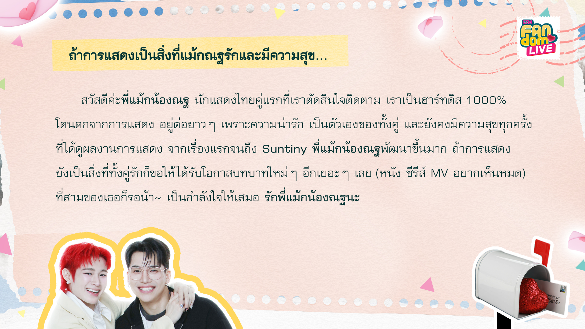 Hi P'Max and N'Nat! You two are the first Thai actor couple we've chosen to follow, and we’re 1000% dedicated fans. We adore your acting and plan to stick with you for a long time because of your charm and individuality. Every time we watch you perform, it brings us joy. From your first project to Suntiny, it’s clear how much you’ve both grown. If acting remains your passion, we really hope you get plenty of chances for new roles—movies, series, music videos—we want to see it all! We’re also looking forward to your third project. We’ll always be cheering you on. We love P'Max and N'Nat!