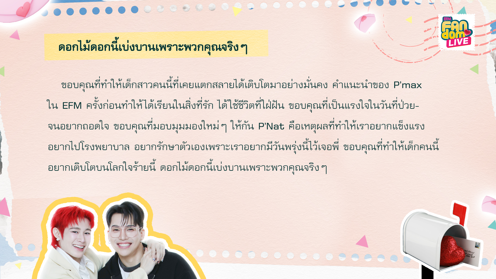 Thank you for helping this girl, who once felt broken, to grow steadily. P'Max's advice during the last EFM truly inspired me to pursue my passions and live my dream life. I’m grateful for your support on that tough day when I was feeling ill and thought about giving up. Thank you for opening my eyes to new perspectives. P’Nat, you're the reason I strive to be strong. I want to go to the hospital and heal because I look forward to a future where I can be with all of you. Thank you for encouraging this child to want to flourish in such a harsh world. This flower has genuinely bloomed because of you.