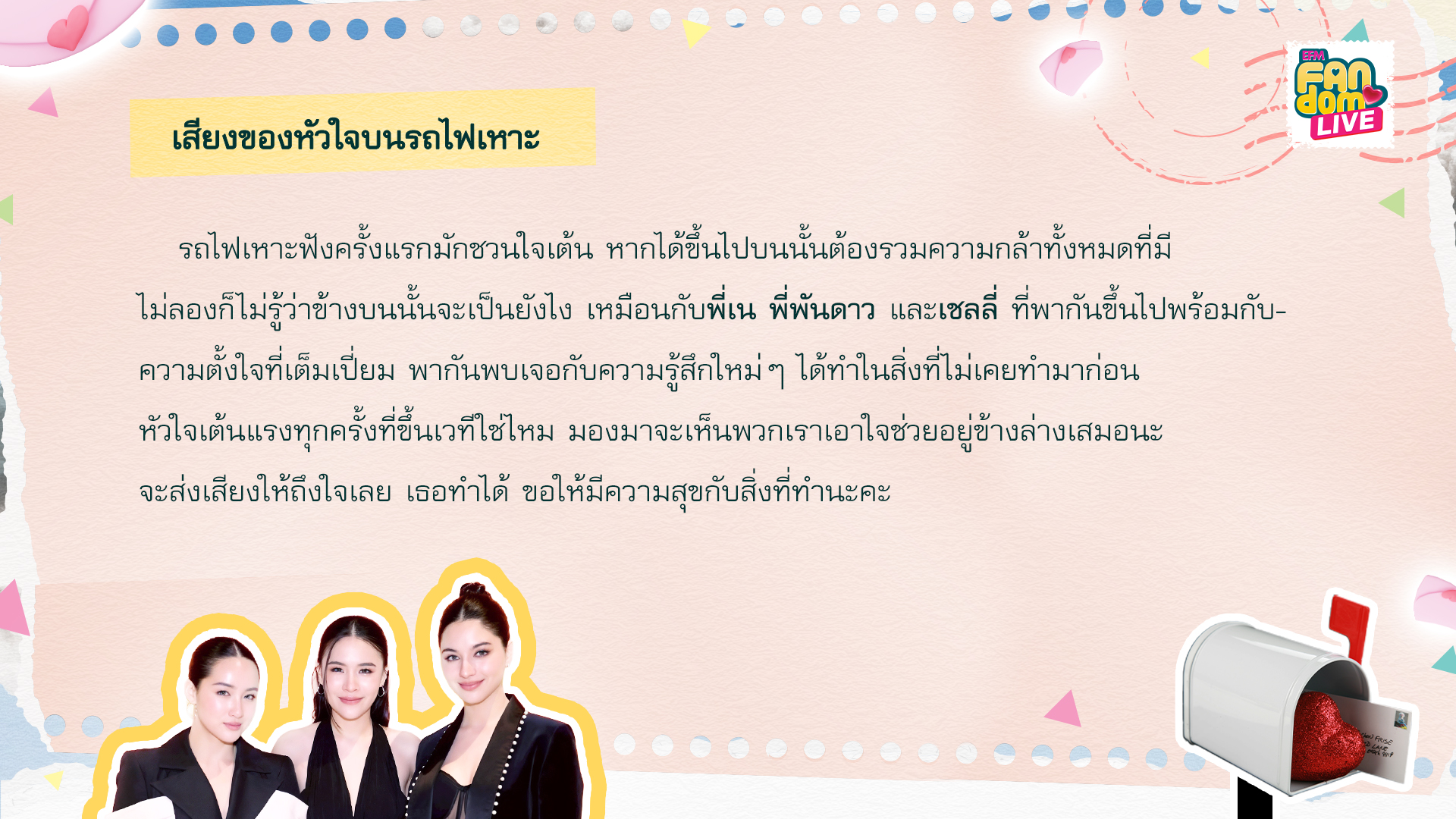 รถไฟเหาะฟังครั้งแรกมักชวนใจเต้น หากได้ขึ้นไปบนนั้นต้องรวมความกล้าทั้งหมดที่มี ไม่ลองก็ไม่รู้ว่าข้างบนนั้นจะเป็นยังไง เหมือนกับพี่เน พี่พันดาว และเชลลี่ ที่พากันขึ้นไปพร้อมกับความตั้งใจที่เต็มเปี่ยม พากันพบเจอกับความรู้สึกใหม่ๆ ได้ทำในสิ่งที่ไม่เคยทำมาก่อน หัวใจเต้นแรงทุกครั้งที่ขึ้นเวทีใช่ไหม มองมาจะเห็นพวกเราเอาใจช่วยอยู่ข้างล่างเสมอนะ จะส่งเสียงให้ถึงใจเลย เธอทำได้ ขอให้มีความสุขกับสิ่งที่ทำนะคะ