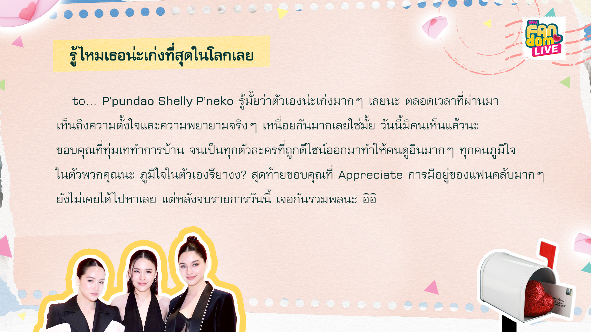 To… P’Pundao, P’ Shelly and P’Neko. Did you know how talented you really are? I've noticed your dedication and hard work all along. You must be exhausted, right? Well, today, someone recognized that. I truly appreciate your commitment and how every character you created resonated so deeply with the audience. Everyone is so proud of you—are you proud of yourself too? And I also want to thank you for valuing your fans so much. I’ve never had the chance to see you perform, but after today’s show, see you at the gathering.