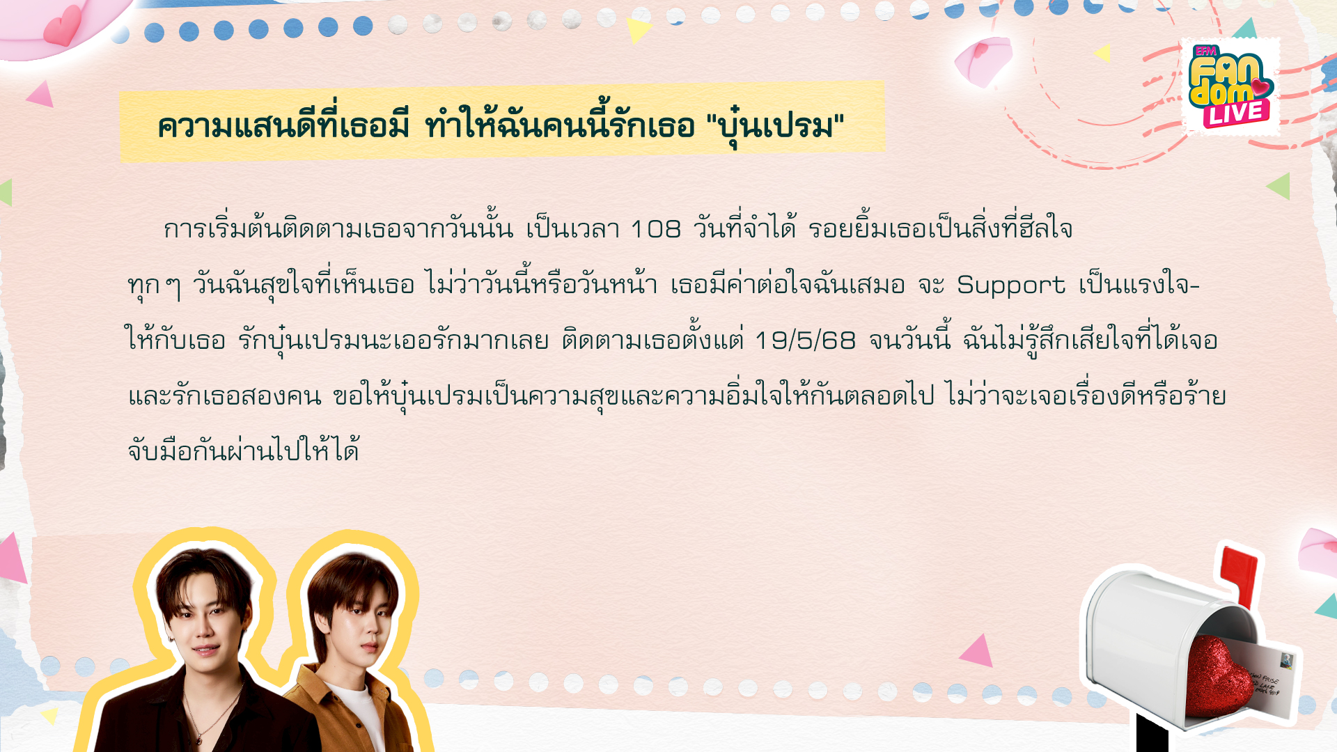 การเริ่มต้นติดตามเธอจากวันนั้น เป็นเวลา 108 วันที่จำได้ รอยยิ้มเธอเป็นสิ่งที่ฮีลใจ ทุกๆวันฉันสุขใจที่เห็นเธอ ไม่ว่าวันนี้หรือวันหน้า เธอมีค่าต่อใจฉันเสมอ จะ Support เป็นแรงใจให้กับเธอ รักบุ๋นเปรมนะเออรักมากเลย ติดตามเธอตั้งแต่ 19/5/68 จนวันนี้ ฉันไม่รู้สึกเสียใจที่ได้เจอและรักเธอสองคน ขอให้บุ๋นเปรมเป็นความสุขและความอิ่มใจให้กันตลอดไป ไม่ว่าจะเจอเรื่องดีหรือร้าย จับมือกันผ่านไปให้ได้