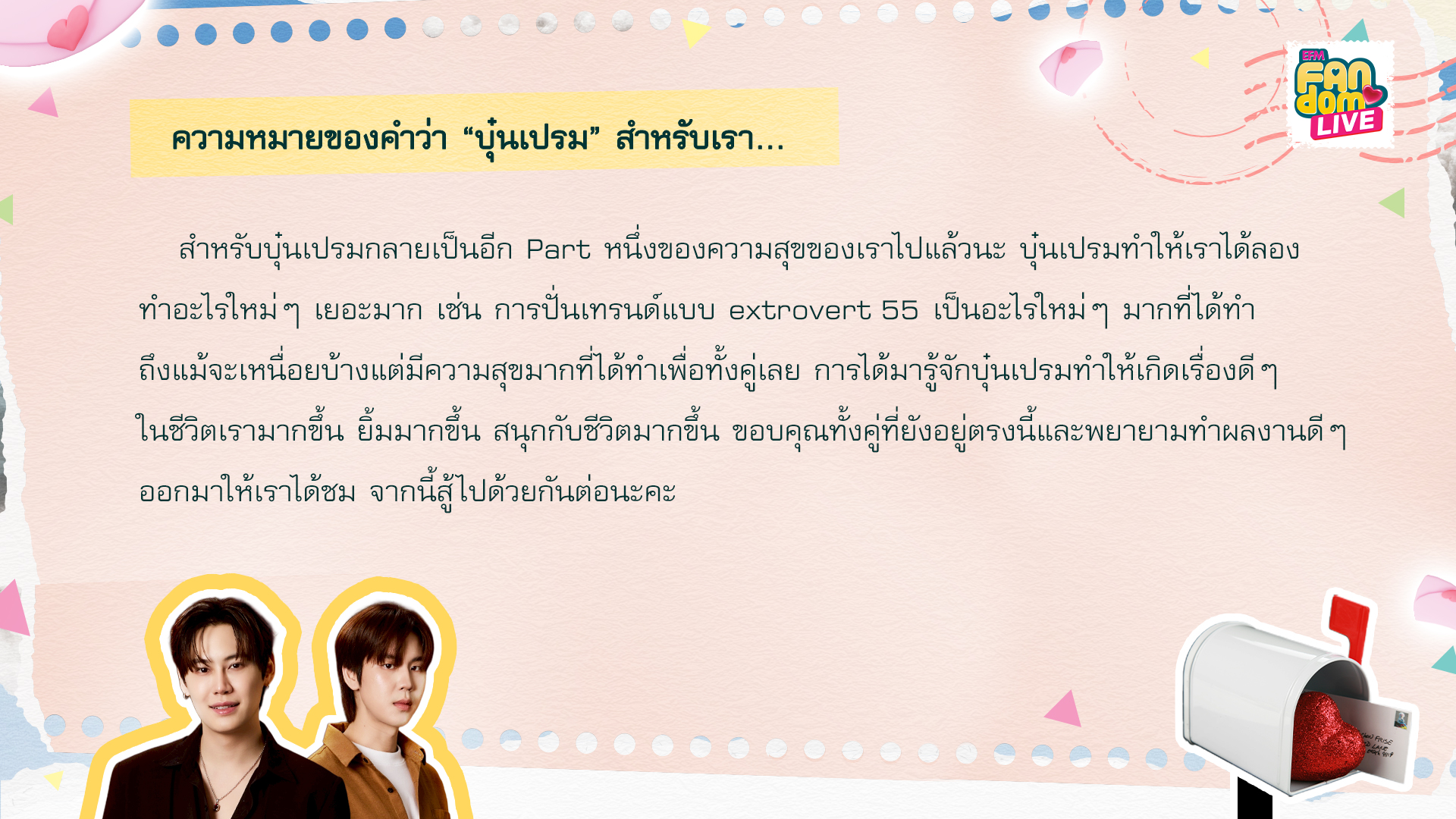 สำหรับบุ๋นเปรมกลายเป็นอีก Part หนึ่งของความสุขของเราไปแล้วนะ บุ๋นเปรมทำให้เราได้ลองทำอะไรใหม่ๆเยอะมาก เช่น การปั่นเทรนด์แบบ extrovert 55 เป็นอะไรใหม่ๆมากที่ได้ทำ ถึงแม้จะเหนื่อยบ้างแต่มีความสุขมากที่ได้ทำเพื่อทั้งคู่เลย การได้มารู้จักบุ๋นเปรมทำให้เกิดเรื่องดีๆในชีวิตเรามากขึ้น ยิ้มมากขึ้น สนุกกับชีวิตมากขึ้น ขอบคุณทั้งคู่ที่ยังอยู่ตรงนี้และพยายามทำผลงานดีๆออกมาให้เราได้ชม จากนี้สู้ไปด้วยกันต่อนะคะ