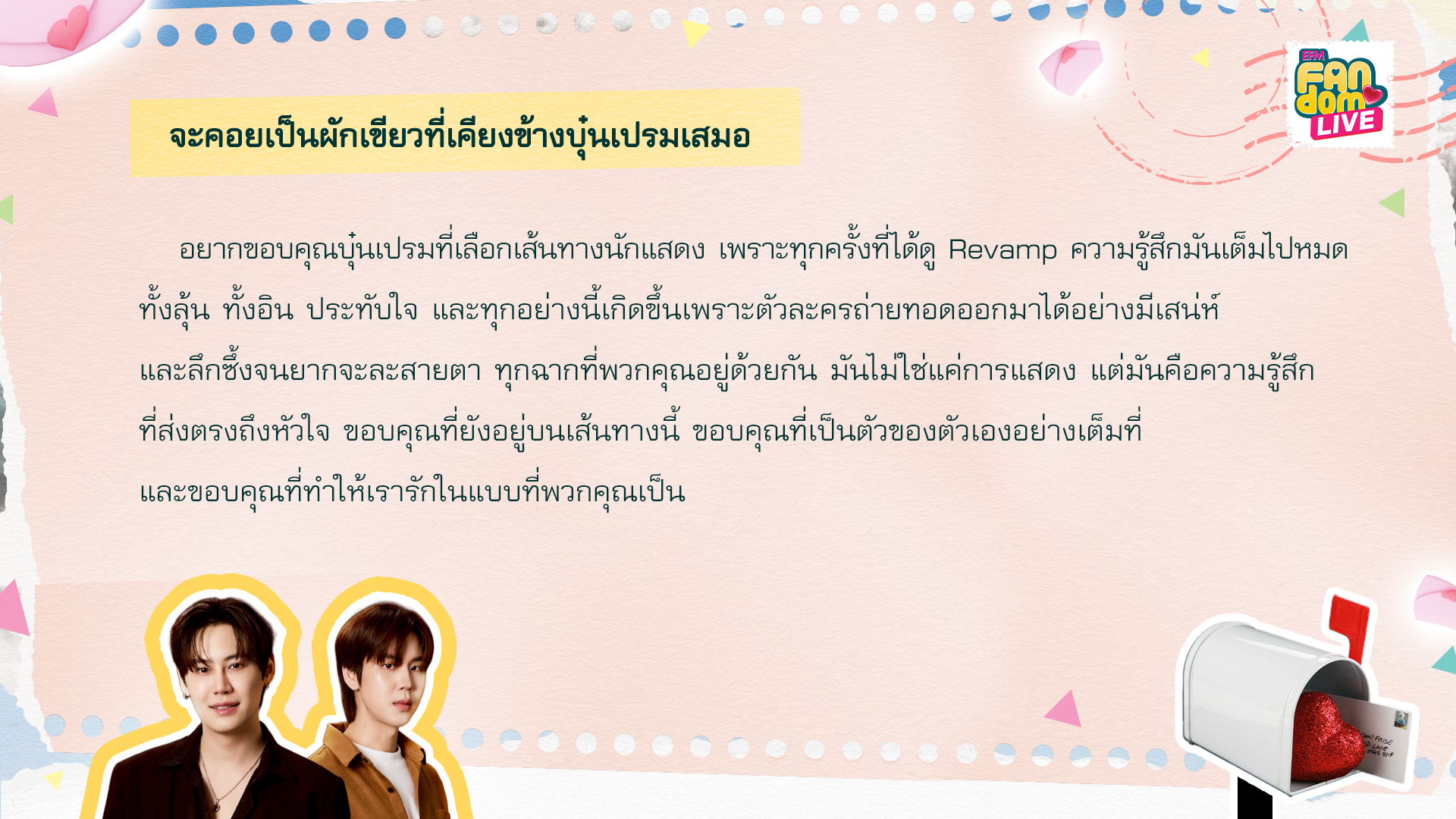 อยากขอบคุณบุ๋นเปรมที่เลือกเส้นทางนักแสดง เพราะทุกครั้งที่ได้ดู Revamp ความรู้สึกมันเต็มไปหมด ทั้งลุ้น ทั้งอิน ประทับใจ และทุกอย่างนี้เกิดขึ้นเพราะตัวละครถ่ายทอดออกมาได้อย่างมีเสน่ห์และลึกซึ้งจนยากจะละสายตา ทุกฉากที่พวกคุณอยู่ด้วยกัน มันไม่ใช่แค่การแสดง แต่มันคือความรู้สึกที่ส่งตรงถึงหัวใจ ขอบคุณที่ยังอยู่บนเส้นทางนี้ ขอบคุณที่เป็นตัวของตัวเองอย่างเต็มที่ และขอบคุณที่ทำให้เรารักในแบบที่พวกคุณเป็น