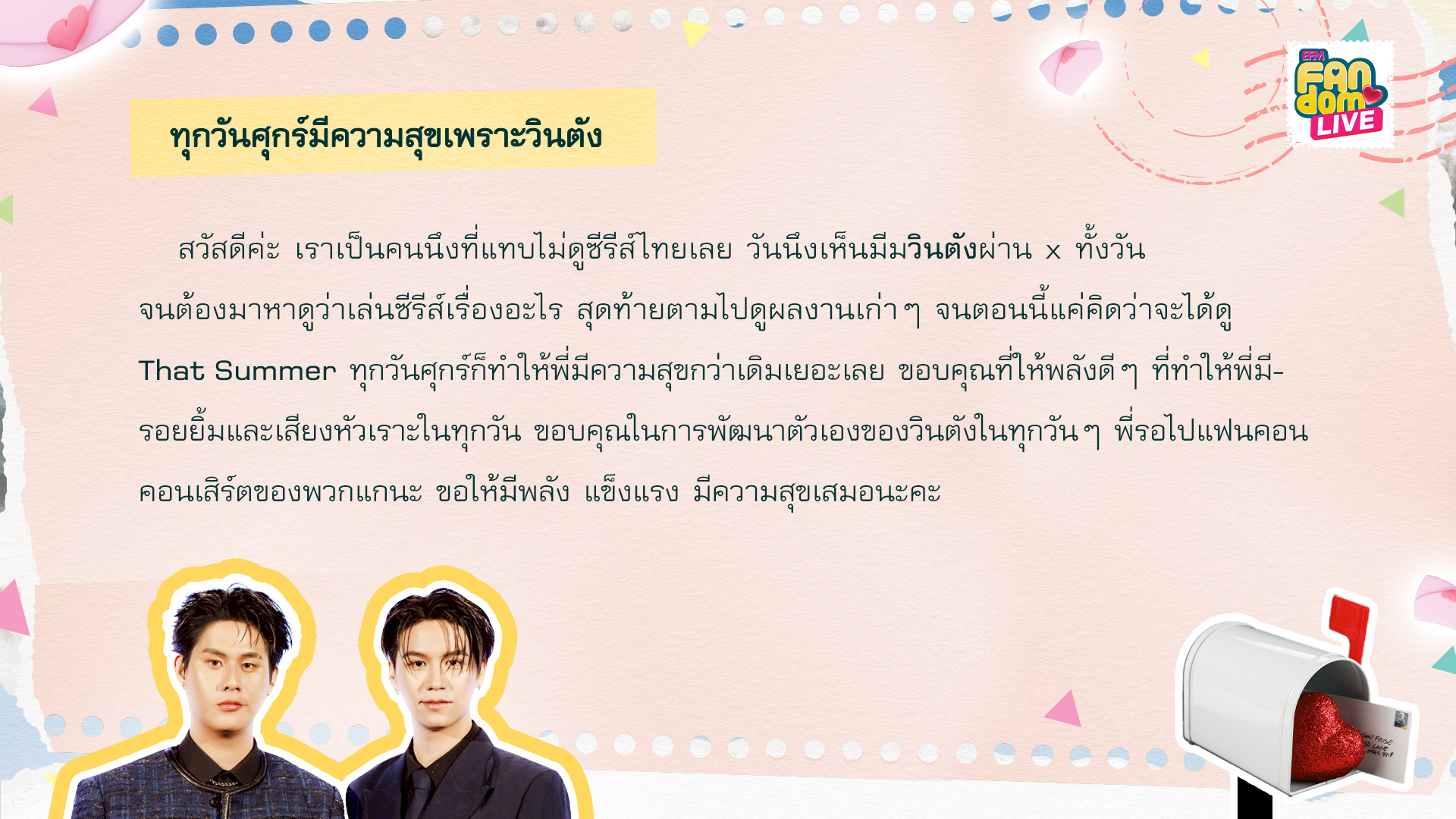 สวัสดีค่ะ เราเป็นคนนึงที่แทบไม่ดูซีรีส์ไทยเลย วันนึงเห็นมีมวินตังผ่าน x ทั้งวัน จนต้องมาหาดูว่าเล่นซีรีส์เรื่องอะไ รสุดท้ายตามไปดูผลงานเก่าๆ จนตอนนี้แค่คิดว่าจะได้ดู That Summer ทุกวันศุกร์ก็ทำให้พี่มีความสุขกว่าเดิมเยอะเลย ขอบคุณที่ให้พลังดีๆที่ทำให้พี่มีรอยยิ้มและเสียงหัวเราะในทุกวัน ขอบคุณในการพัฒนาตัวเองของวินตังในทุกวันๆ พี่รอไปแฟนคอน คอนเสิร์ตของพวกแกนะ ขอให้มีพลัง แข็งแรง มีความสุขเสมอนะคะ
