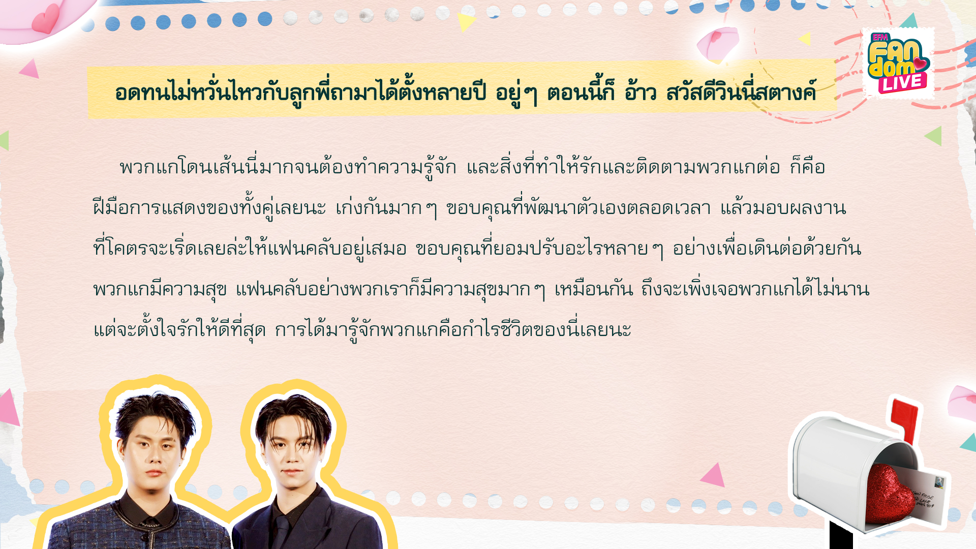 Hi there! I don’t usually watch Thai series, but one day I came across Wintang’s memes everywhere and it made me curious about what show he was in. I decided to check out some of his past work, and now just the thought of watching That Summer every Friday brings me so much joy. I really appreciate the positive vibes you bring that make me smile and laugh each day. Thank you for all the effort you put into Wintang’s growth. I’m eagerly looking forward to your fan concerts. Wishing you lots of strength and happiness always!