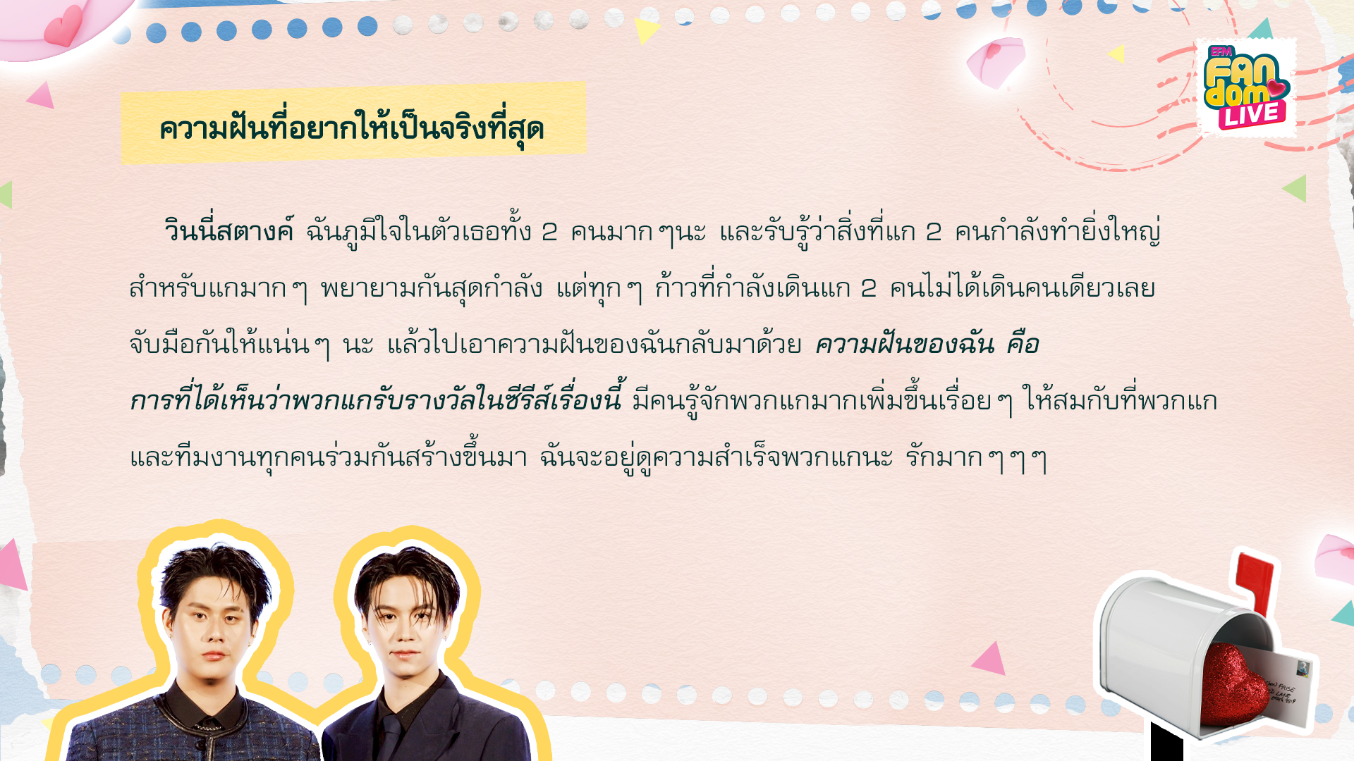 วินนี่สตางค์ ฉันภูมิใจในตัวเธอทั้ง 2 คนมากๆนะ และรับรู้ว่าสิ่งที่แก 2 คนกำลังทำยิ่งใหญ่สำหรับแกมากๆ พยายามกันสุดกำลัง แต่ทุกๆก้าวที่กำลังเดินแก 2 คนไม่ได้เดินคนเดียวเลย จับมือกันให้แน่นๆนะ แล้วไปเอาความฝันของฉันกลับมาด้วย ความฝันของฉัน คือ การที่ได้เห็นว่าพวกแกรับรางวัลในซีรีส์เรื่องนี้ มีคนรู้จักพวกแกมากเพิ่มขึ้นเรื่อยๆ ให้สมกับที่พวกแกและทีมงานทุกคนร่วมกันสร้างขึ้นมา ฉันจะอยู่ดูความสำเร็จพวกแกนะ รักมากๆๆๆ”
