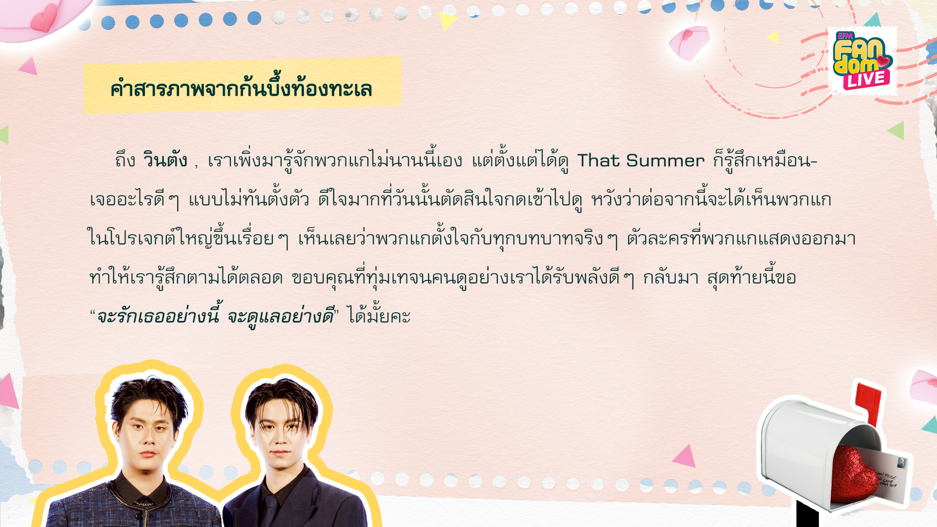 ถึง วินตัง , เราเพิ่งมารู้จักพวกแกไม่นานนี้เอง แต่ตั้งแต่ได้ดู That Summer ก็รู้สึกเหมือนเจออะไรดีๆแบบไม่ทันตั้งตัว ดีใจมากที่วันนั้นตัดสินใจกดเข้าไปดู หวังว่าต่อจากนี้จะได้เห็นพวกแกในโปรเจกต์ใหญ่ขึ้นเรื่อยๆ เห็นเลยว่าพวกแกตั้งใจกับทุกบทบาทจริงๆตั วละครที่พวกแกแสดงออกมาทำให้เรารู้สึกตามได้ตลอด ขอบคุณที่ทุ่มเทจนคนดูอย่างเราได้รับพลังดีๆกลับมา สุดท้ายนี้ขอ “จะรักเธออย่างนี้ จะดูแลอย่างดี” ได้มั้ยคะ
