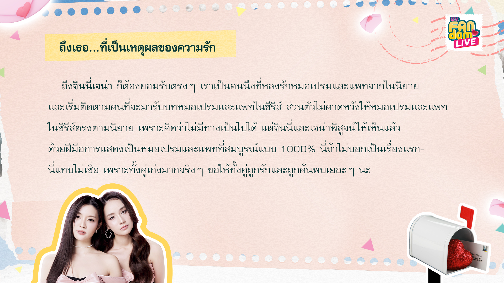 Thank you for all the hard work and dedication that have brought you both to this point. You truly shine as a beacon of hope for your fans. Even on the darkest days, there are clips and series featuring you that inspire me to embrace life with enthusiasm. Ever since "Phit Rak" (Love Poison) premiered, I've been eagerly counting down the hours to Saturday night at 10:30 PM. I honestly don't want the series to come to an end. It feels like a captivating love story that, like an uncurable poison, has me completely captivated by Ginny and Jayna.