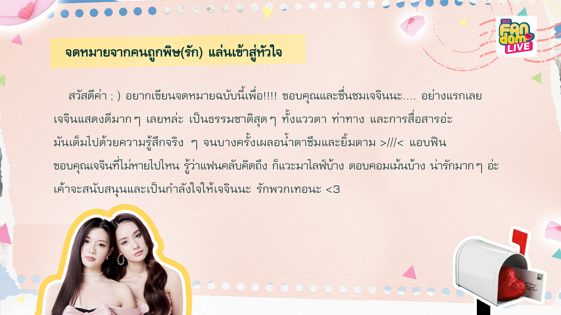 สวัสดีค่า ; ) อยากเขียนจดหมายฉบับนี้เพื่อ!!!! ขอบคุณและชื่นชมเจจินนะ…. อย่างแรกเลย เจจินแสดงดีมากๆ เลยหล่ะ เป็นธรรมชาติสุดๆ ทั้งแววตา ท่าทาง และการสื่อสารอ่ะ มันเต็มไปด้วยความรู้สึกจริง ๆ จนบางครั้งเผลอน้ำตาซึมและยิ้มตาม >///< แอบฟิน ขอบคุณเจจินที่ไม่หายไปไหน รู้ว่าแฟนคลับคิดถึง ก็แวะมาไลฟ์บ้าง ตอบคอมเม้นบ้าง น่ารักมากๆอ่ะ เค้าจะสนับสนุนและเป็นกำลังใจให้เจจินนะ รักพวกเทอนะ <3